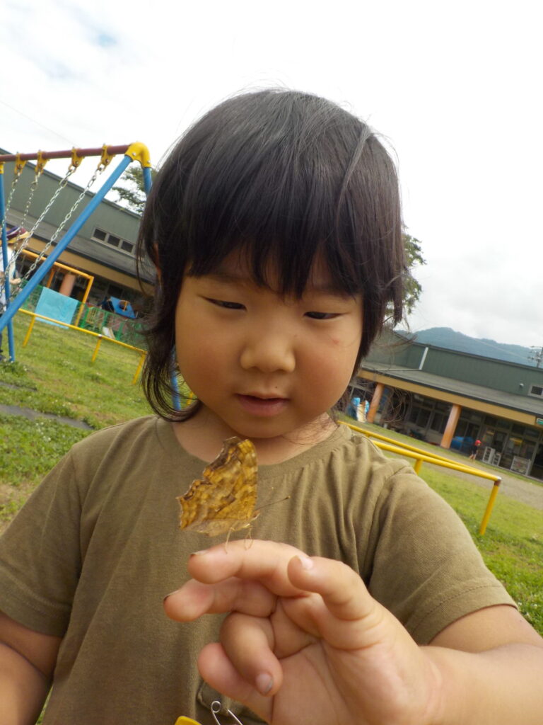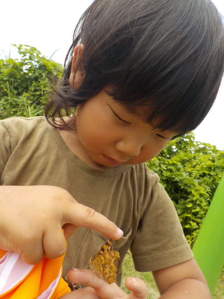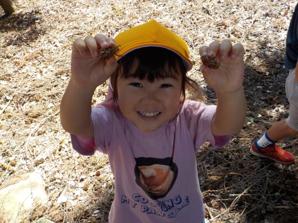 友達と相談し合う姿が印象的でした。蝉だとちょっと怖いと感じる友だちも、抜け殻だと触れることができ、嬉しかったようです。
