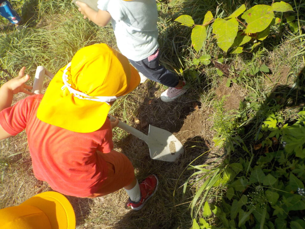 生存しているカブトムシは逃がし、死んでしまったカブトムシはお墓を作ってあげたいという結果を話し合って決めた後、ほとんどの子が今日の予定に「カブトムシを逃がしてから園庭に行ってくる」など自分の予定にカブトムシとの別れを入れていた。カブトムシを運ぶ子、草をかき分ける子、穴を掘ってあげる子、土をかぶせる子・・それぞれが参加し、お別れができた。一人ひとりが話し合いに参加し、向き合い、当事者意識を持って行動できたと思う。そこに参加しなかった子もこれから受け止める日がちゃんと来ると思います。その時は一緒に考えていきたいです。