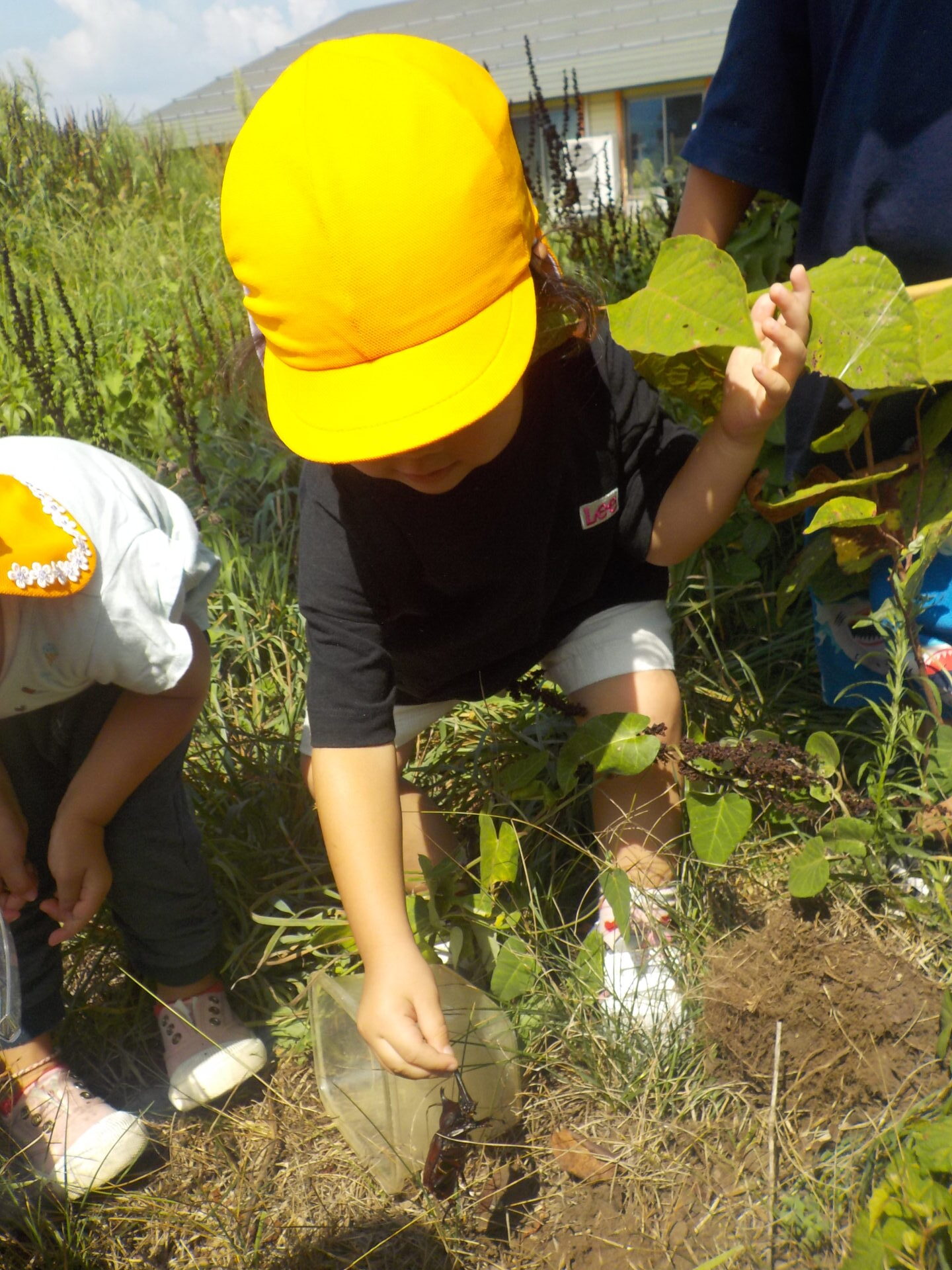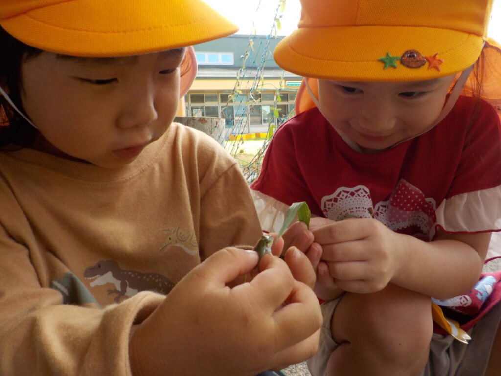 触れない友達も興味が出て来て葉っぱでツンツン。「エサだよー」