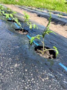 マルチに空いた穴の中に大切に苗を植え、そっと土をかけました。