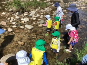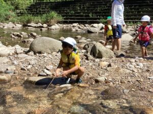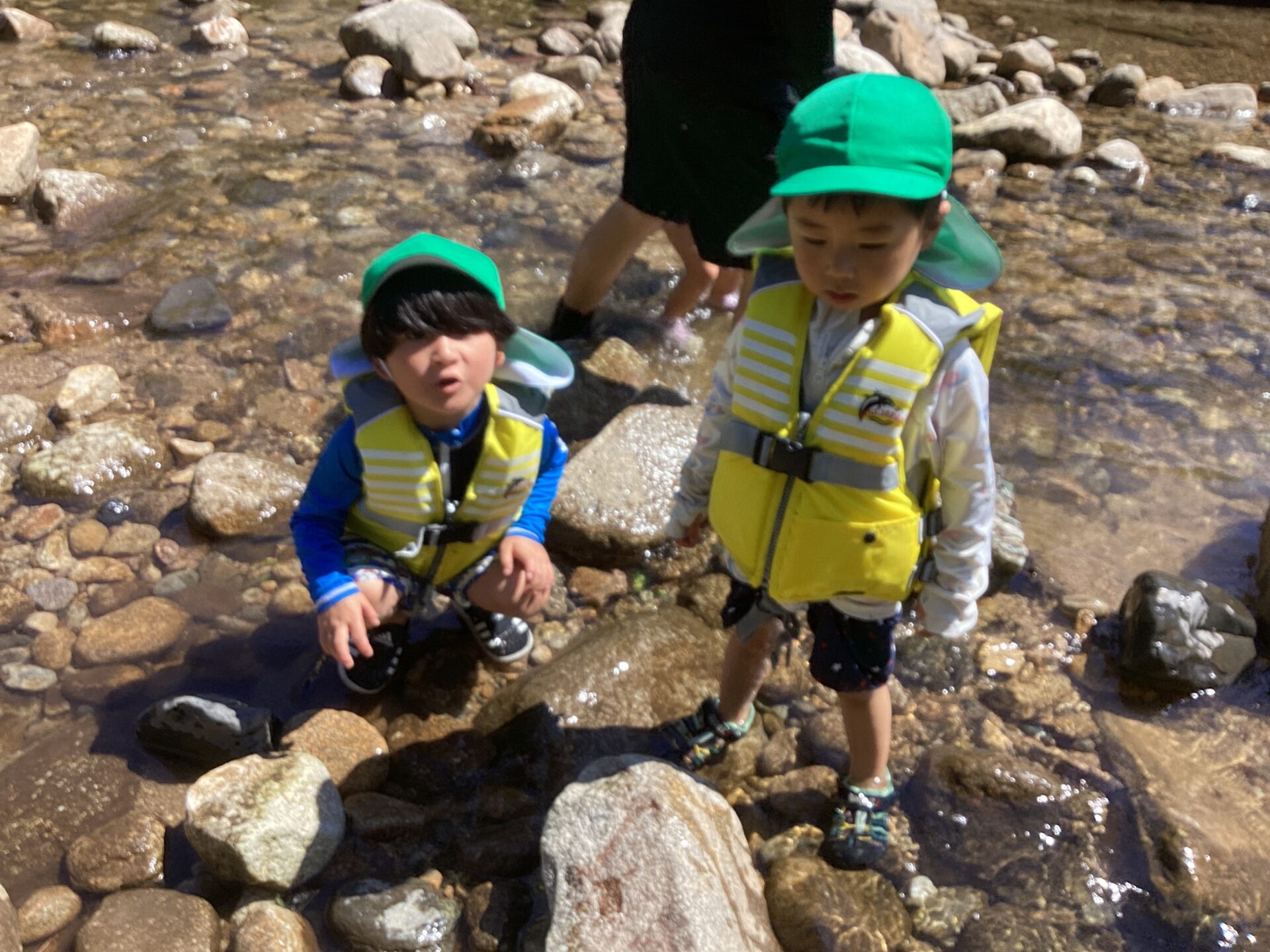 川遊びをすることや持ち物、活動内容、お約束等を前々から話を聞いていた子ども達は、朝から着替えをとても張り切っていました。川の中では、保育士と手を繋ぎながらゆっくり歩く子、ザブザブ歩く子様々でした。スタッフの人に流れ方のお手本を見せてもらい、今年は積極的に流れたい子が沢山いました!初めは緊張していましたが、すぐに笑顔の表情で楽しんでいました。一度、経験すると「もういっかいやる!」と言って何度も上流へ行って何度も流れて楽しみ、とても良い経験ができたと思います。