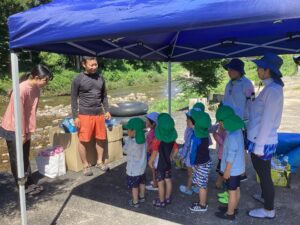 7月25日(金) 前から楽しみにしていた川遊びに行ってきました!今回はライフジャケットを着て、川を流れたり、タイヤチューブで川を下ったりします。年長・中クラスは今年で2回目、年少クラスは初めてです。当日は朝から張り切って水着にお着替えをして出発しました!