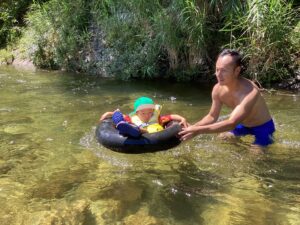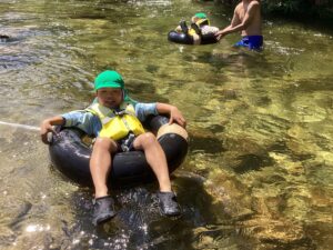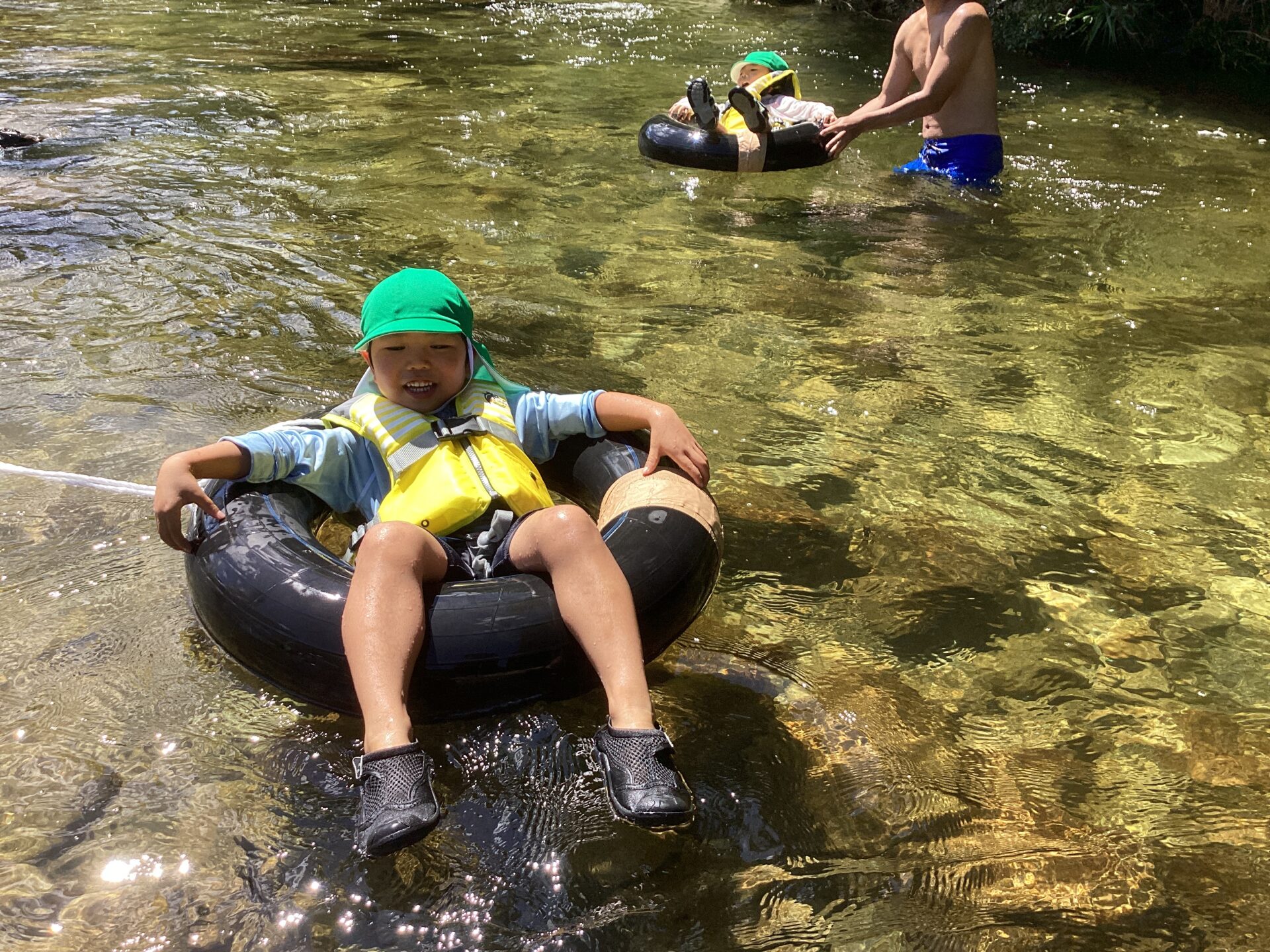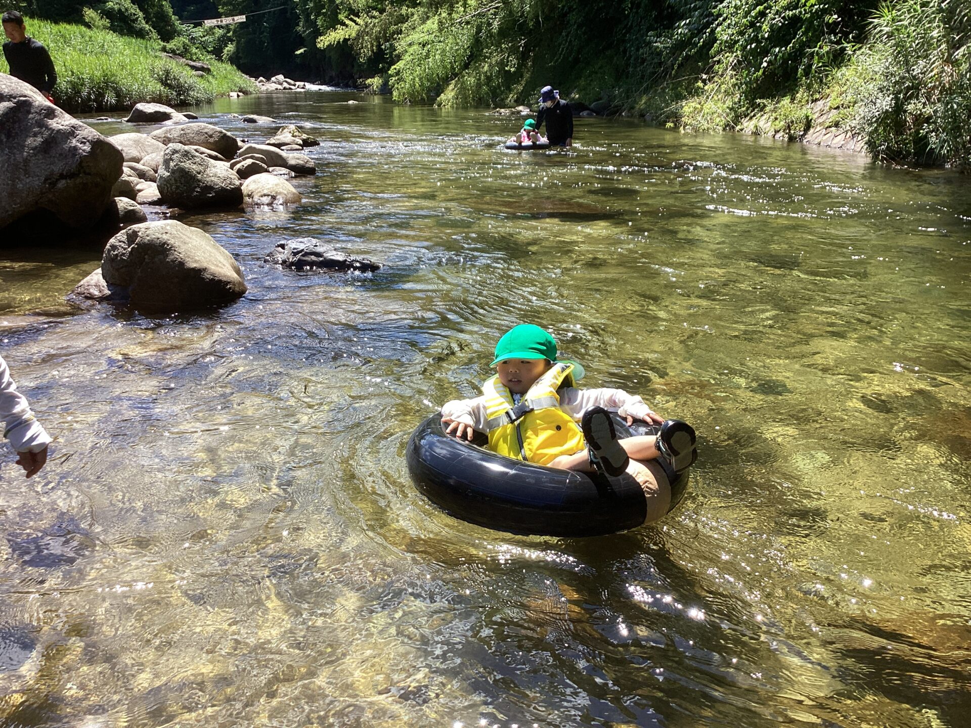 休憩をしたあとは、タイヤのチューブを膨らませたものを浮き輪の代わりにして、川を流れて遊びました!