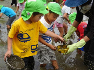 逃げてしまってなかなか捕れないふな。どうすれば捕れるのかお友達と考え、細い溝に追い込み、挟みうちにして捕る方法を見つけた子もいました。