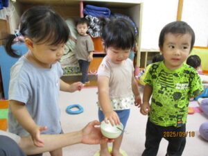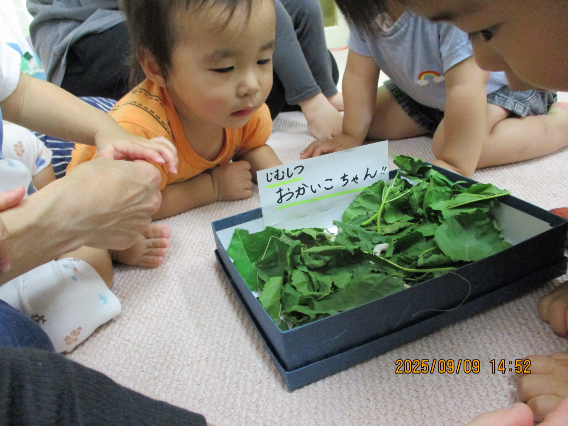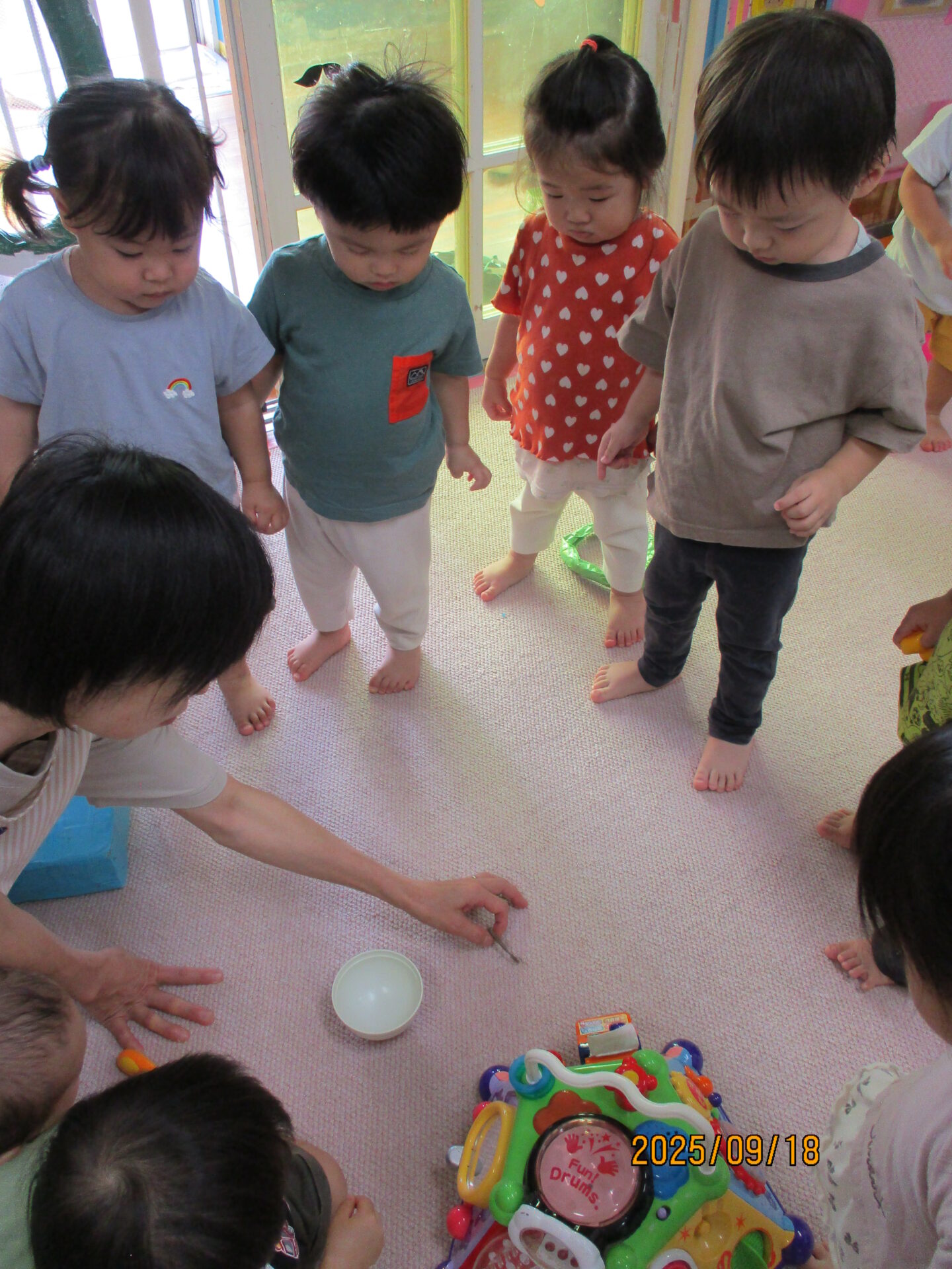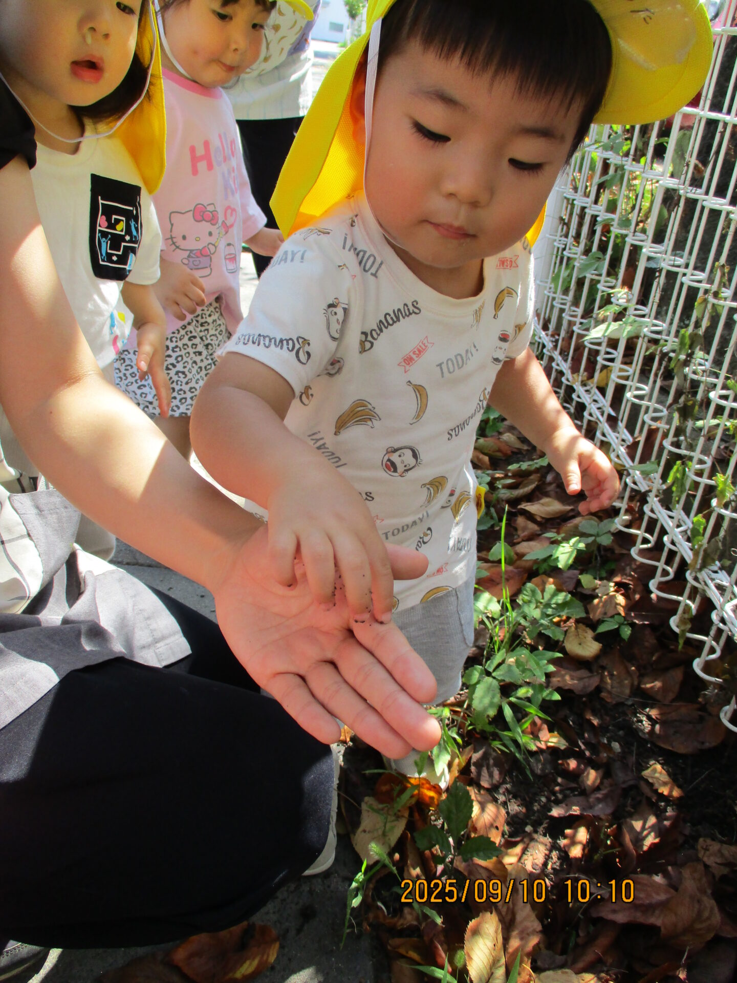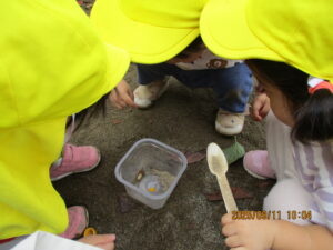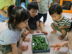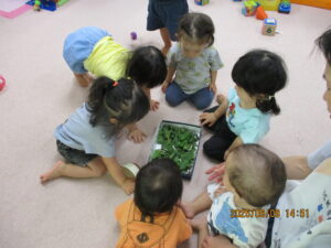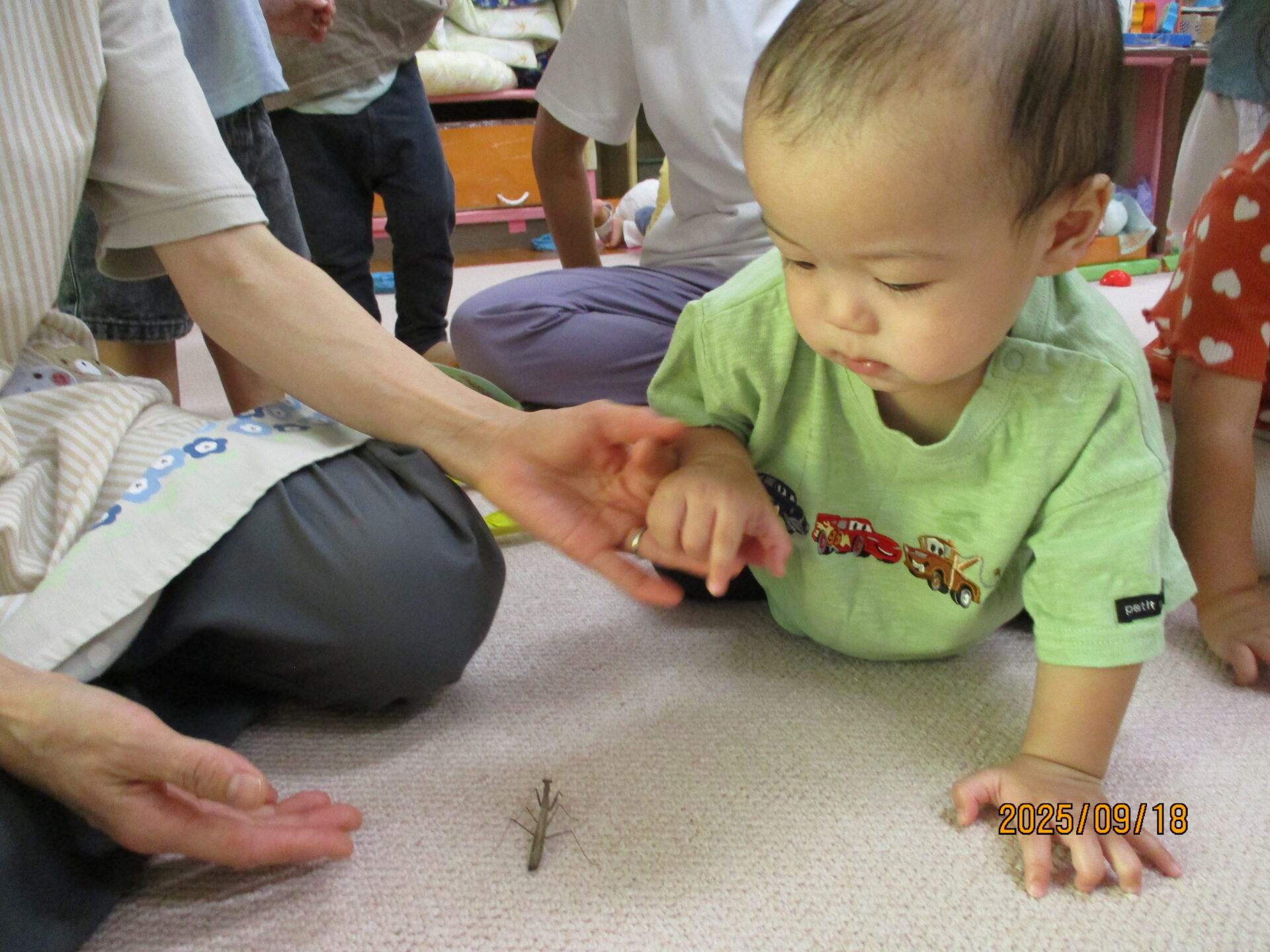日頃、なかなか触れることができない生き物を見たり触れたりする経験をもてるようにしました。「優しくしようね」「そっと触ってごらん」等、保育士の言葉掛けや関わり方から、生き物に対しての優しい気持ちに繋がって欲しいという願いを込めました。これからの季節にも生き物に興味関心をもってたくさんの生き物に触れていきたいです。