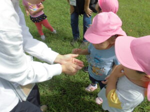 しばらく見ていると保育士の手からバッタが飛び出し、「あ、とんだ!」と驚いていました!