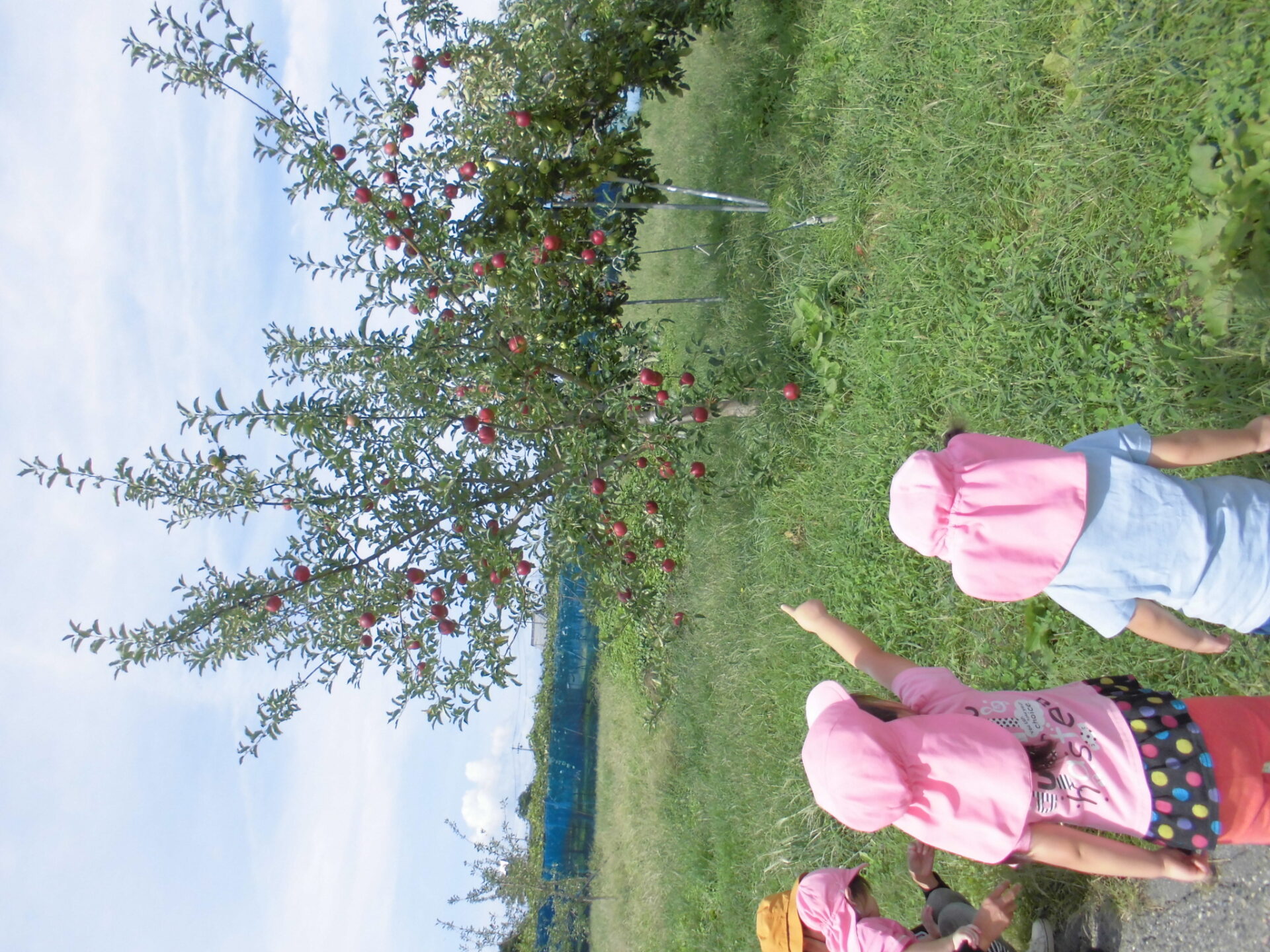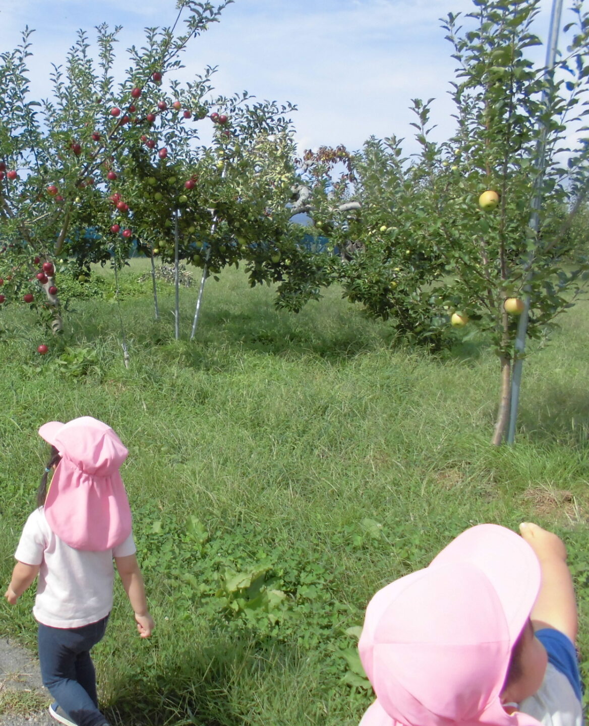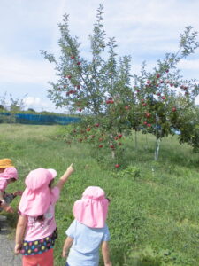 校庭を出て農道を歩いて行くと、「あ、りんごだ!」と畑で真っ赤に色づいたりんごを見つけました。
