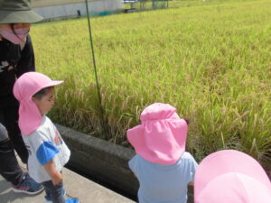 次に後ろを振り返って黄色に色づいた田んぼを発見!「これはなあに?」と不思議そうに近づく子どもたちに「給食で食べているお米だよ」と伝えると「へー!」とじっくり見つめていました。
