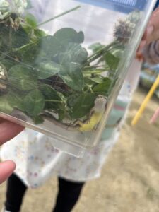 「おうち作ってあげようよ!」と園庭に咲いていたクローバーなどの草を虫かごいっぱいに敷いてあげると・・・