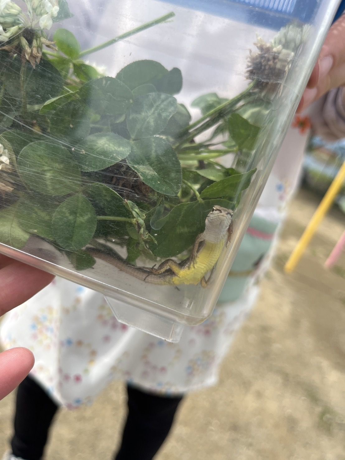 ・生きている物しか食べないカゲチョロ。庭に出ると「好きなのはクモやバッタ」と虫かごをもって捕まえる子どもたち。登園の際にも通学路の水路から小さな虫を捕まえて持ってくる姿もありました。