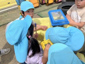 「みせてみせて!」と虫かごに入れて観察をしていました。