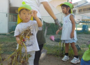 一生懸命引っ張ってみると、たくさんのじゃがいもが出てきて大喜び!「じゃがいも採れた!」と友達や保育士に嬉しそうに見せてくれました。「まだあるかな?」と、その後も大小様々な大きさのじゃがいもを掘り出しました。