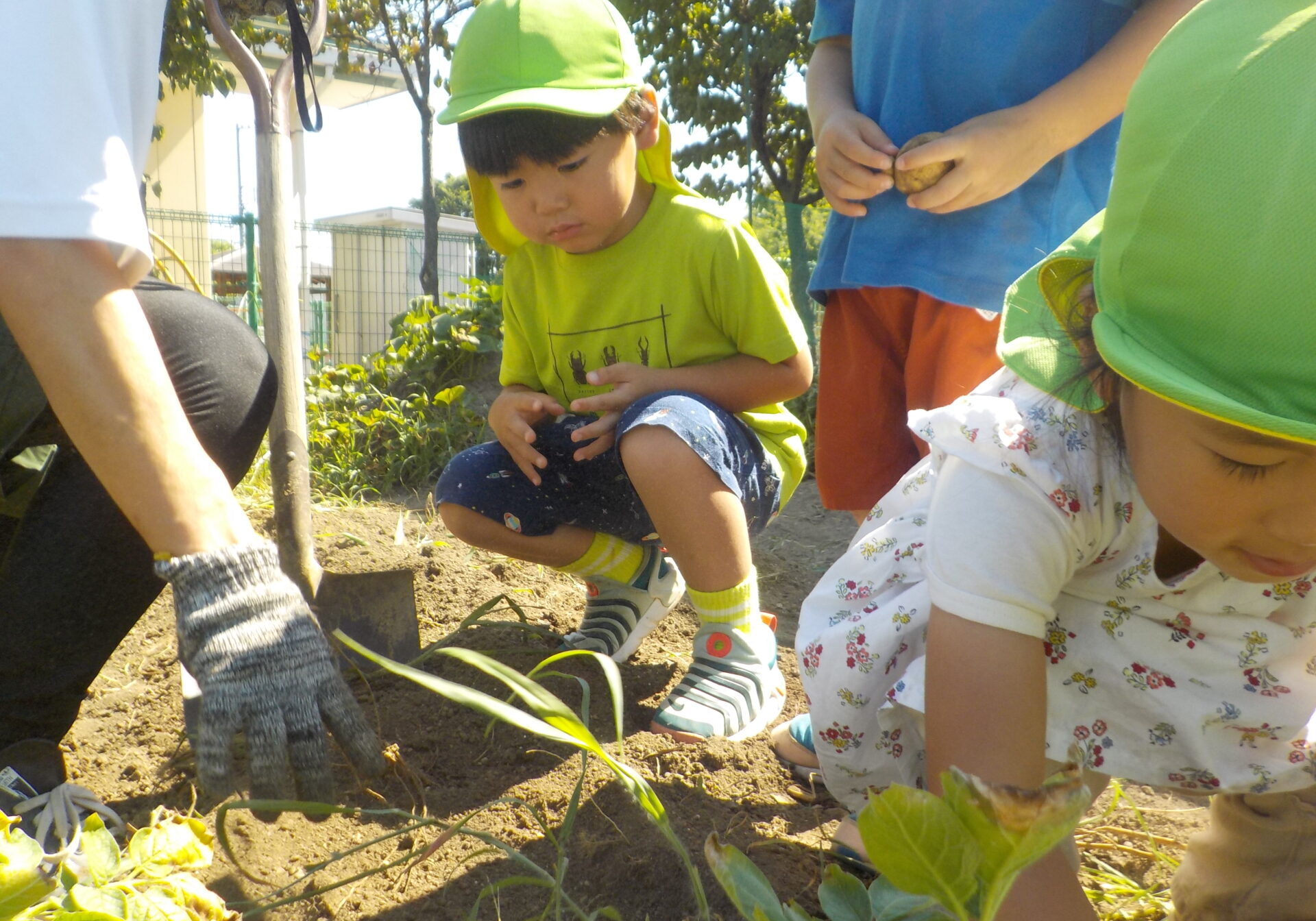 土の中で育つじゃがいもは実の生長は目には見えませんが、葉っぱが大きくなったり、白い花が咲いたりする様子を観察してきました。「この中にじゃがいもあるかな?」「じゃがいも大きくなってるかな?」と畑の様子を伺いながら少し不安そうな子もいましたが…。