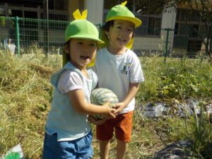 収穫を一番楽しみにしていたのはすいかです。気づくと畑一面が草だらけに…。草取りをしていると、小さなすいかを発見。「すいかできてる!」と大喜びの子どもたちでした。「もっと大きくなあれ!」と願いを込めて様子を見守ってきました。