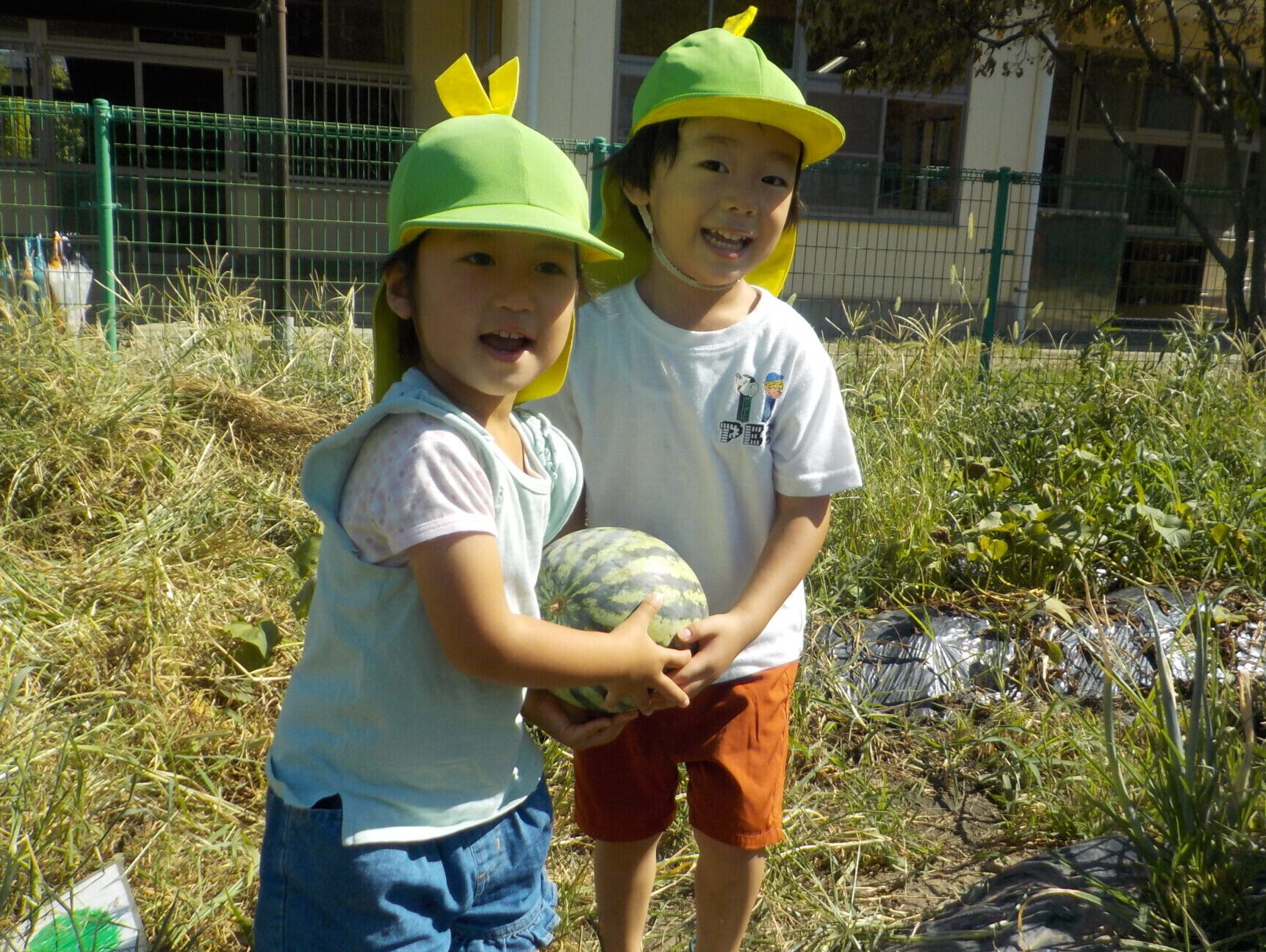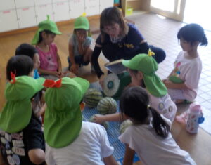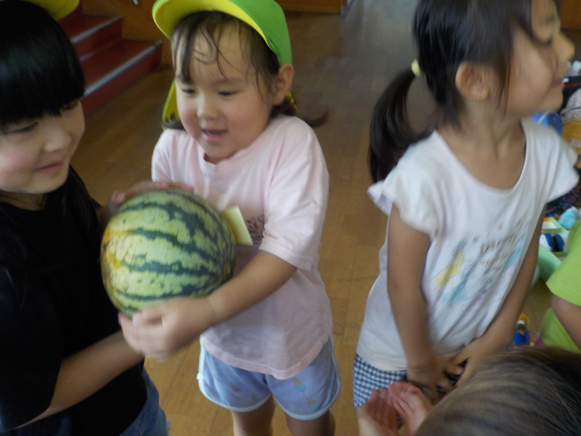 いよいよ収穫の日!大きいものだと子どもたちの顔の大きさくらいのすいかを収穫することができました。「一人で持てるよ!」という力自慢の子もいれば、「落とさないようにしてね」と慎重派の子もいて友達と仲良く運んでいました。