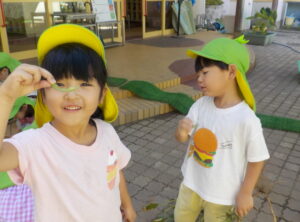 畑で育てているいろいろ野菜の生長の様子を見ていく中で、葉の形や大きさの違い、上に伸びていく野菜や地面を這うようにツルが伸びていく野菜と野菜によって生長の仕方に気づきました。「早く大きくならないかな?」という友達の呟きに対して、「大きいすいか食べたいよね!」「もっとお水あげなきゃ枯れちゃう!」など、子どもたちなりに考えて世話をする姿がありました。