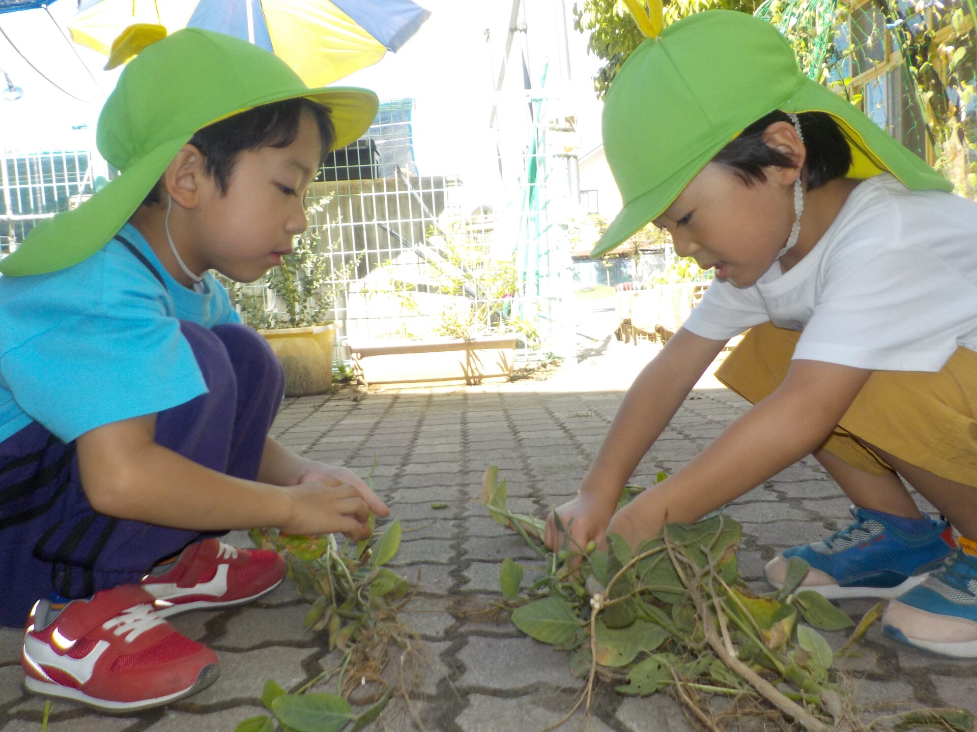 えだまめの房が膨らんでくると、「もう食べられる?」「触ってもいい?」と興味津々。触ってみると「固いよ?」「え、柔らかいところもあるよ!」と感触の違いに気づいた子どもたち。「あんまり強く触ると潰れちゃうよ」と、力加減もしっかりとしていました。