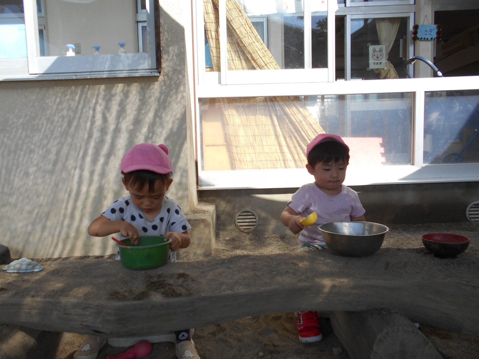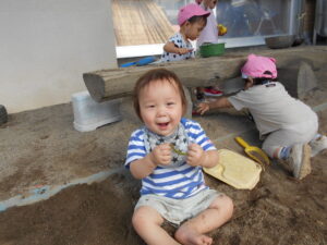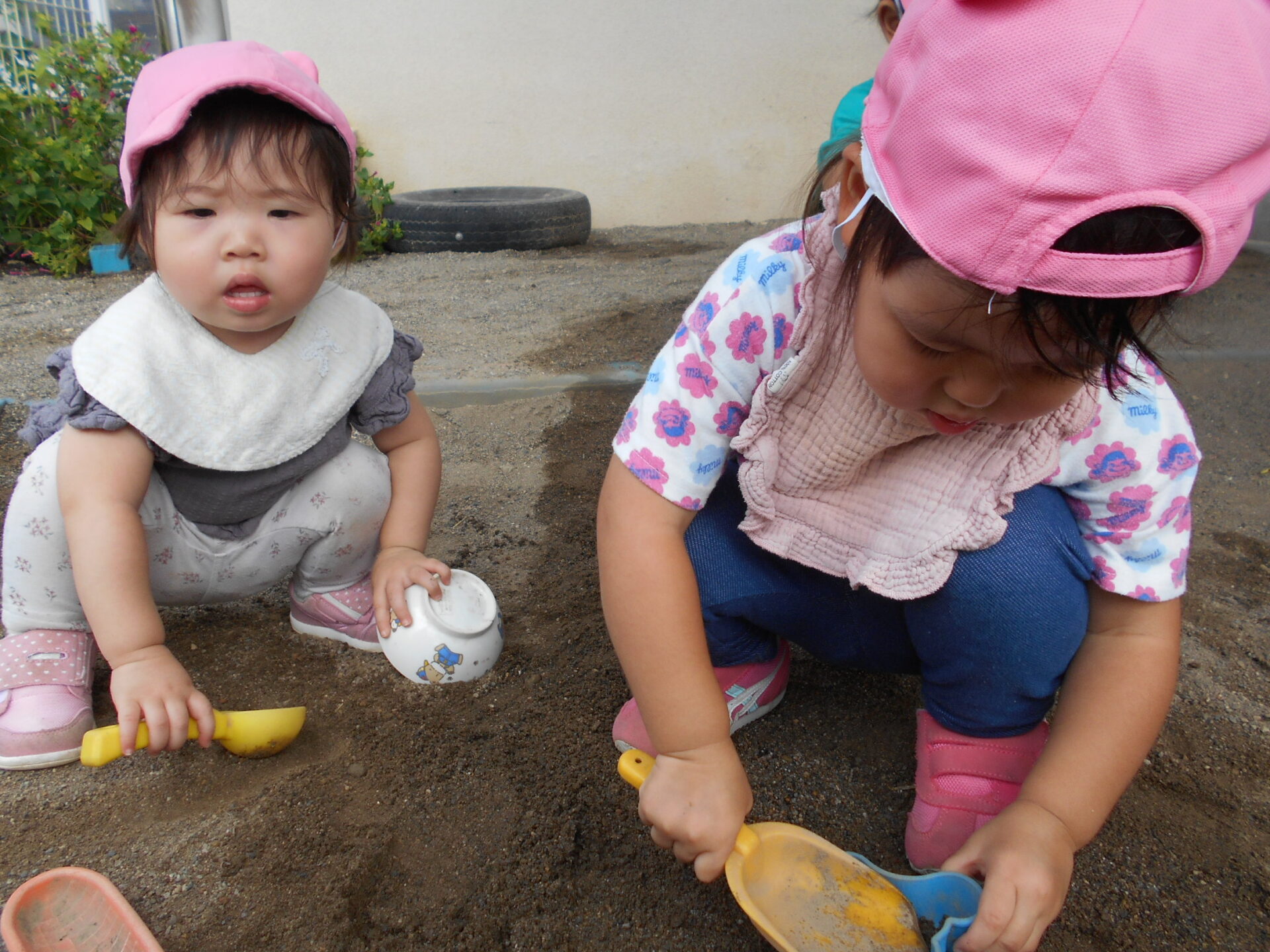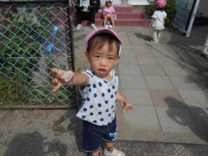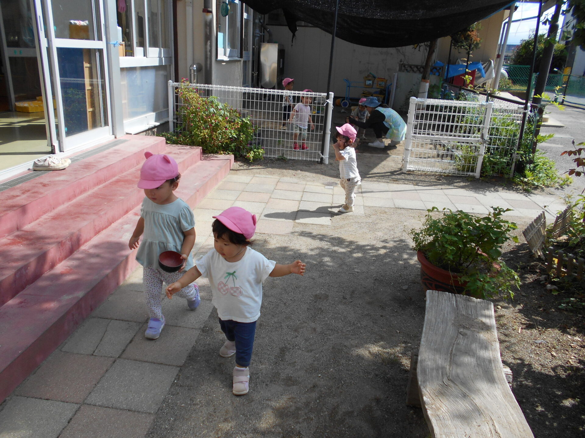 暑かった夏も終わり、秋の気配を感じる今日この頃。庭に出て遊ぶ0•1歳の子どもたちです。