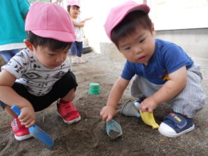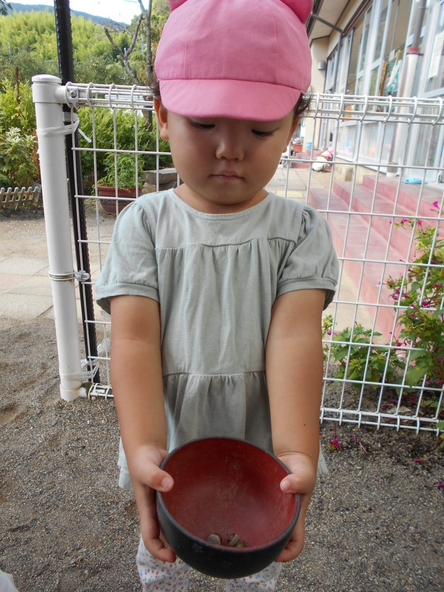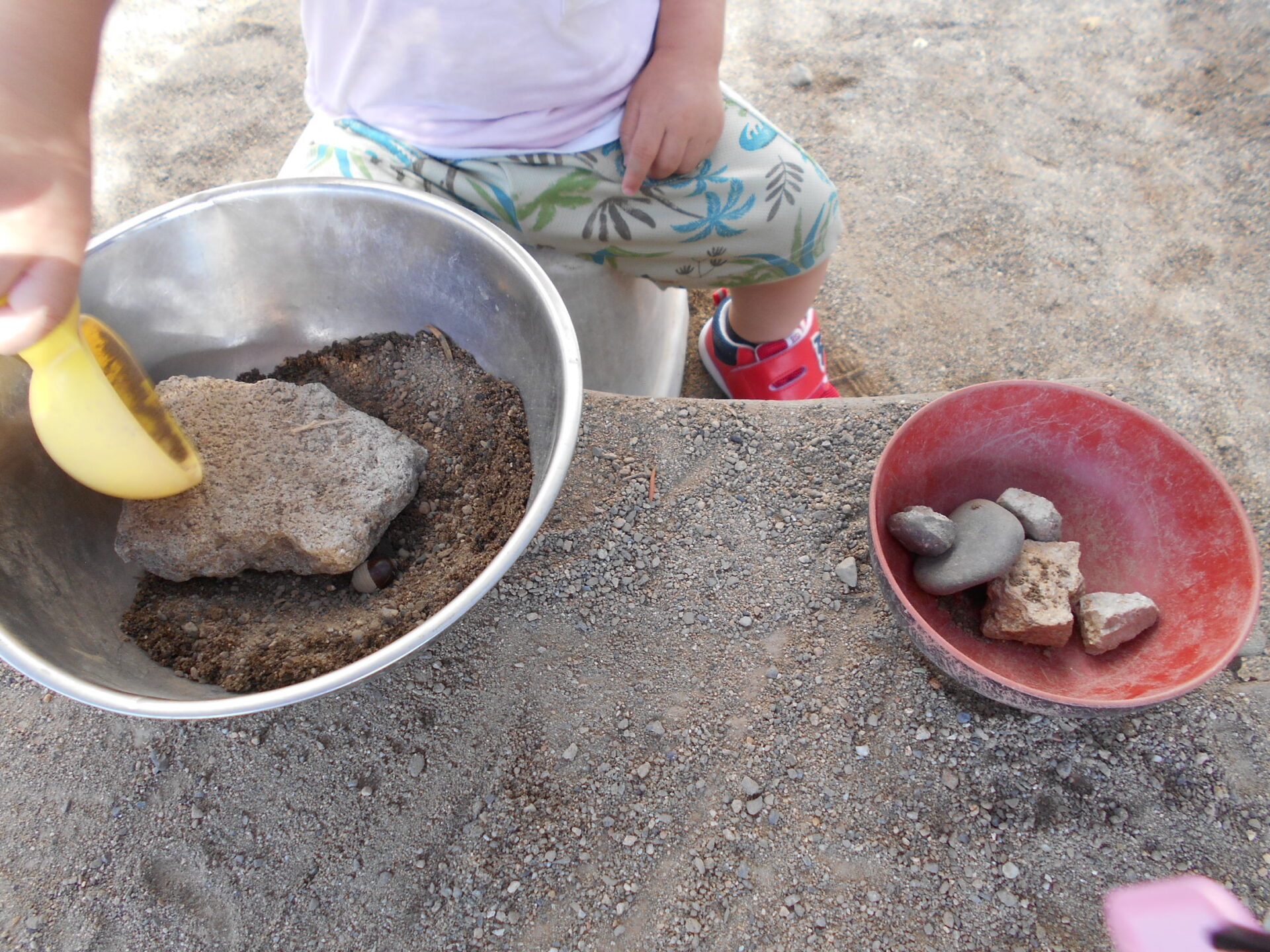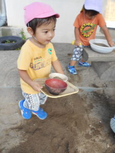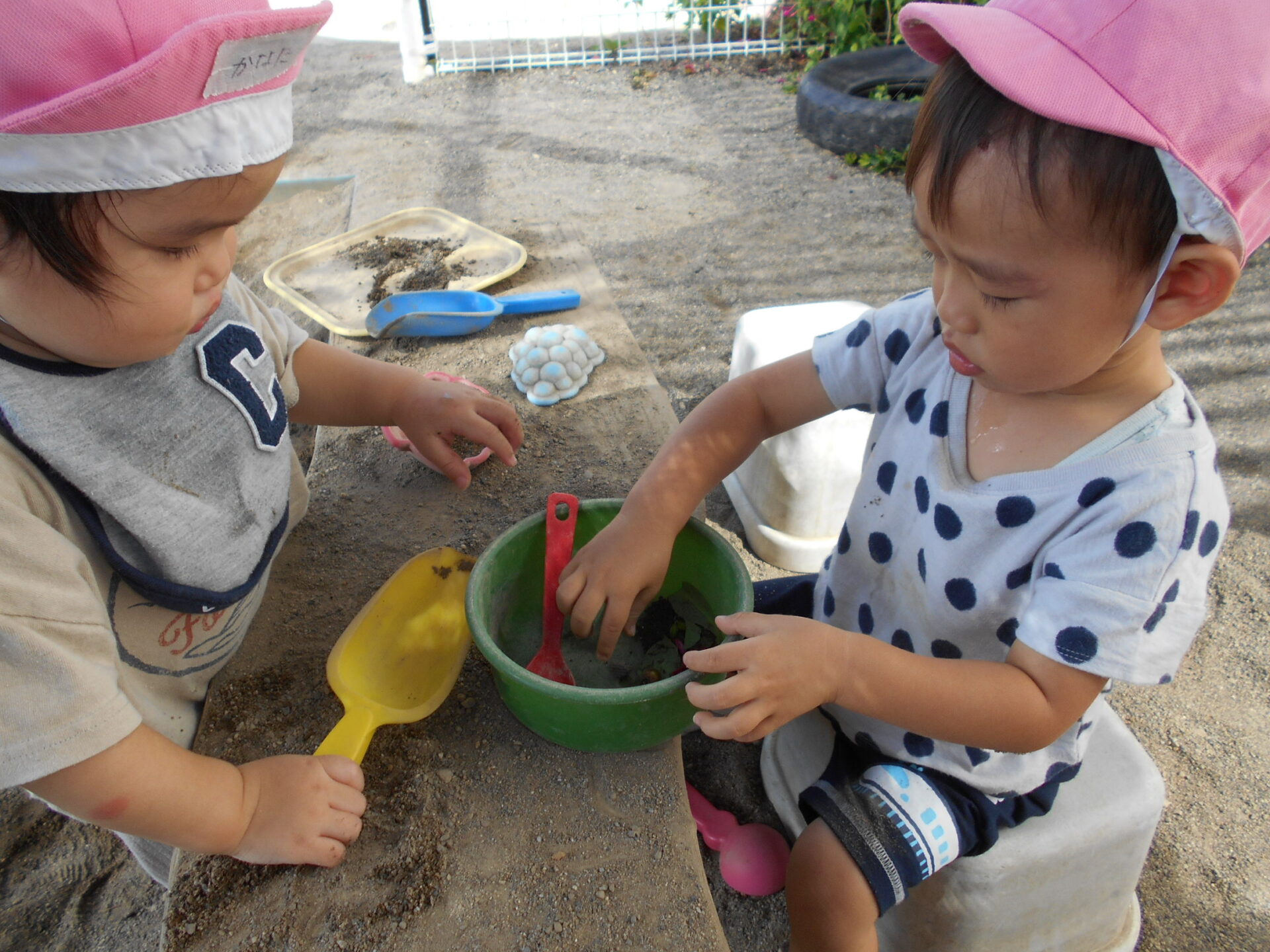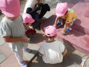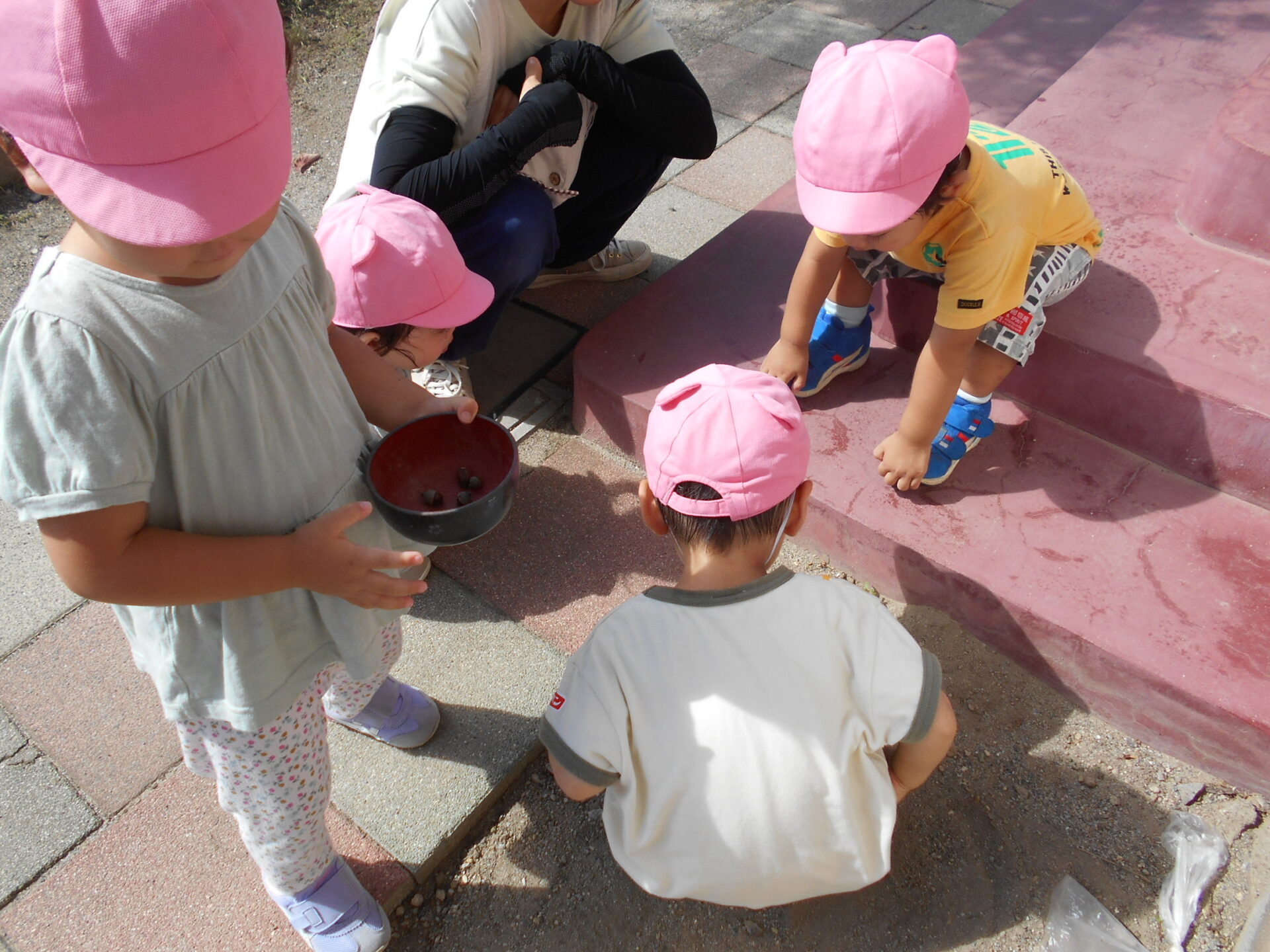・花や葉っぱ、小石やどんぐりなどの自然物を最初は保育士が一緒に遊ぶときに使っていましたが、保育士が持って行くと受け取り、ままごとに使うようになりました。少しずつ自分で見つけて使うようにもなってきているので、子どもたちの発見を大切にしていこうと思います。