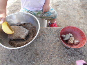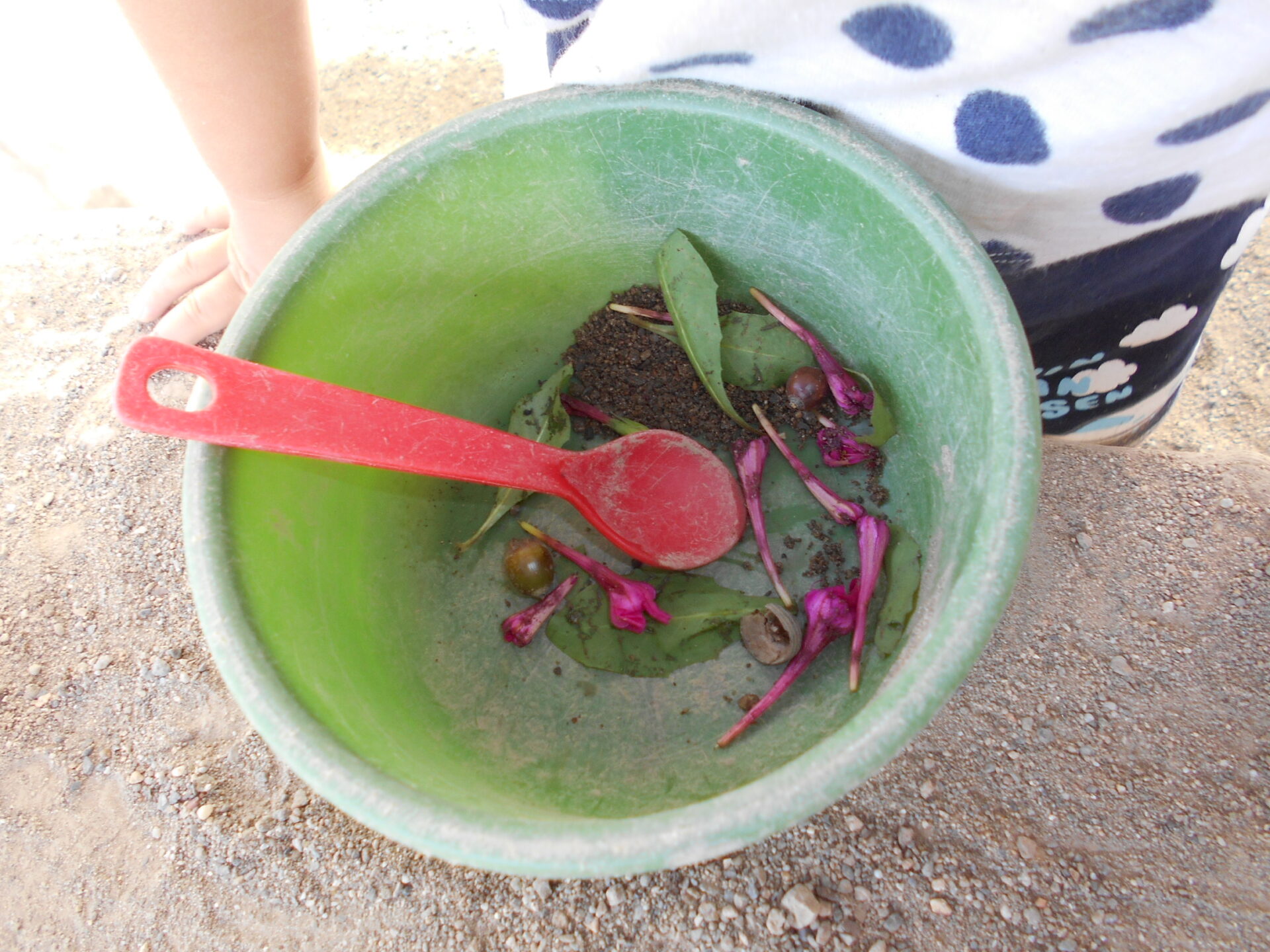 花や葉っぱ、小石、どんぐりを使ってままごとをしていました。