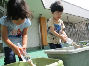 ・自分達で育てた栽培物を使いケーキを作ったことで、喜びを感じながら、友達とイメージを広げ、遊びに発展できたと思った。子どものイメージを大切にし、これからの遊びでも取り入れていきたい。