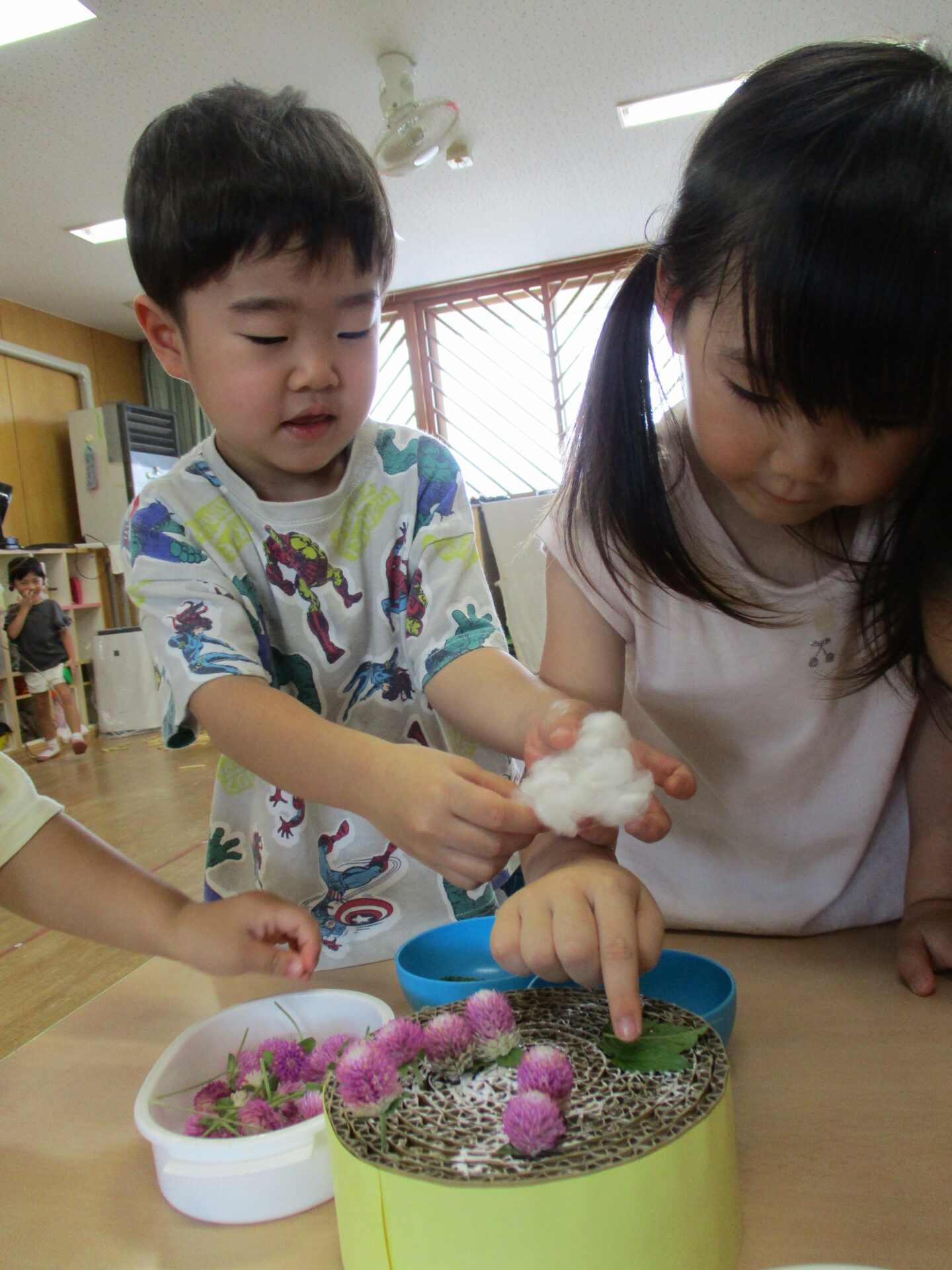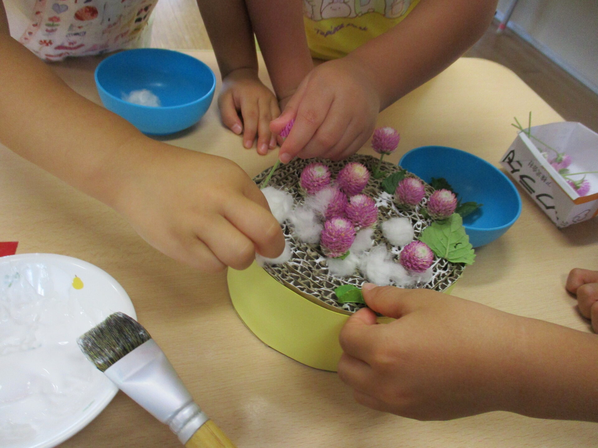 千日紅や綿をケーキのいちごやクリームに見立てて、友達とどんなケーキにするかおしゃべりしながら、おいしそうに飾り付けをしました。