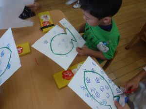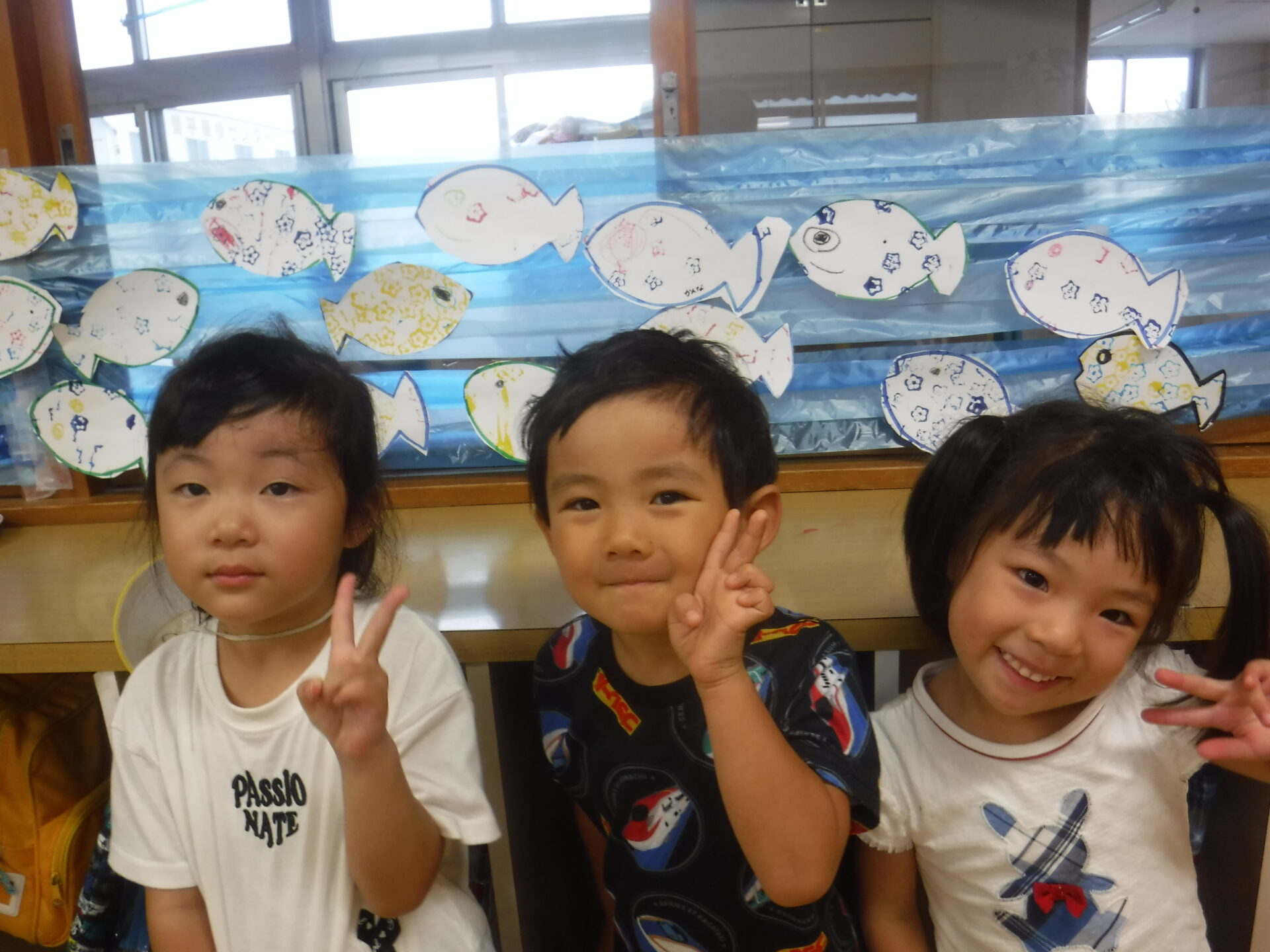 スタンプしたあとはどうする?「そうだ!お魚に変身させようよ!」魚の形に合わせてハサミで切りました。