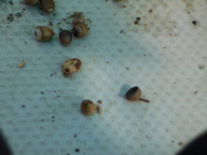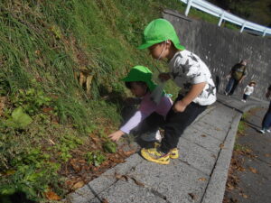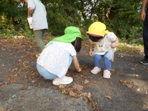 「こんなに丸いのあるよ」「これは帽子付き」 お気に入りのどんぐりも見つかったようです。
