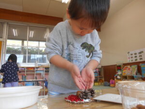 拾ったどんぐりは園庭やお部屋で遊びの中へ。