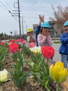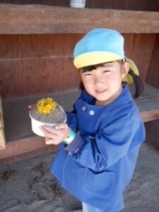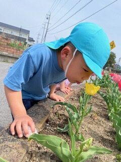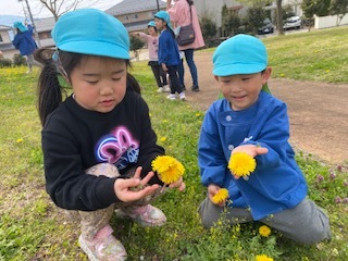 園庭の草花を摘んでいる子どもたちの姿から、色々な種類の草花に触れることが出来るように散歩を計画しました。身近にある草花や虫、自然に気付き触れることで親しみを感じてほしいと思います。これからも散歩にでかけ子どもたちが四季折々の自然を五感で感じてほしいです。また、友だちと一緒にこれからもたくさん身近な自然に触れて楽しく遊びが広がっていったら良いなと思います。