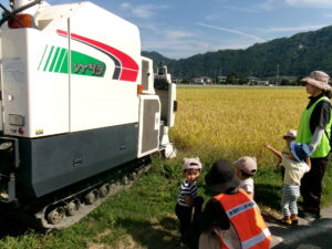 「お米大きくなったねー。」「コンバイン大きいねー。」なんてお話していると、田んぼの向こうから「そこの田んぼ、好きに入っていいからねー。」と近所の方が声を掛けてくださいました。