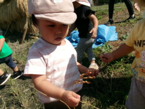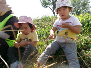 拾った穂にも興味津々。「これ、みんなが食べるご飯なんだよ。」の言葉を理解できる子はびっくりして、「おこめ・・・」とつぶやきながら、摘んで取っていました。