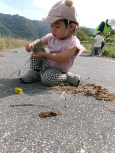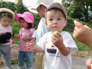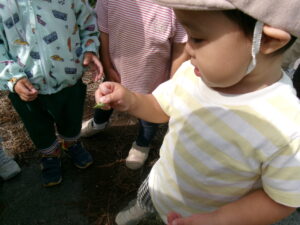 クルミ、大きな葉っぱ、バッタ、草などたくさん見つけ、保育士だけでなく友だちにも「あったよ!」と伝える姿がたくさん見られました。お散歩の中でも、子どもたちのはじめてがいっぱいです。