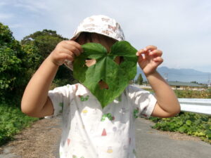 顔が隠れるくらい大きな葉っぱに目と口の穴が空いていました。