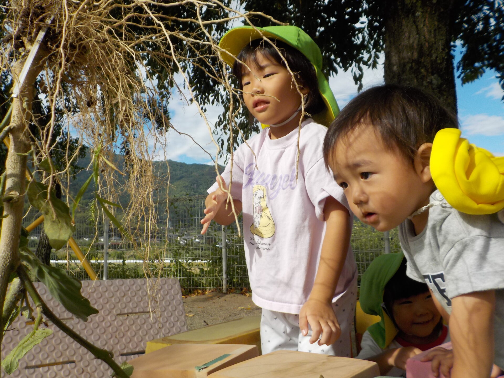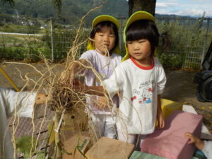 初めて見る根っこに子ども達は興味津々。代わる代わる根っこを触ったり、匂いを嗅いだりしていました。