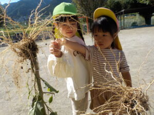 ・野菜栽培は実の生長に目が行きがちですが、子ども達が毎日欠かさず水やりをしていたその水は、根っこが吸い上げてここまで実や葉っぱが大きくなったのだということも知って欲しいと思い、根っこを抜く活動を子ども達と一緒にしました。
