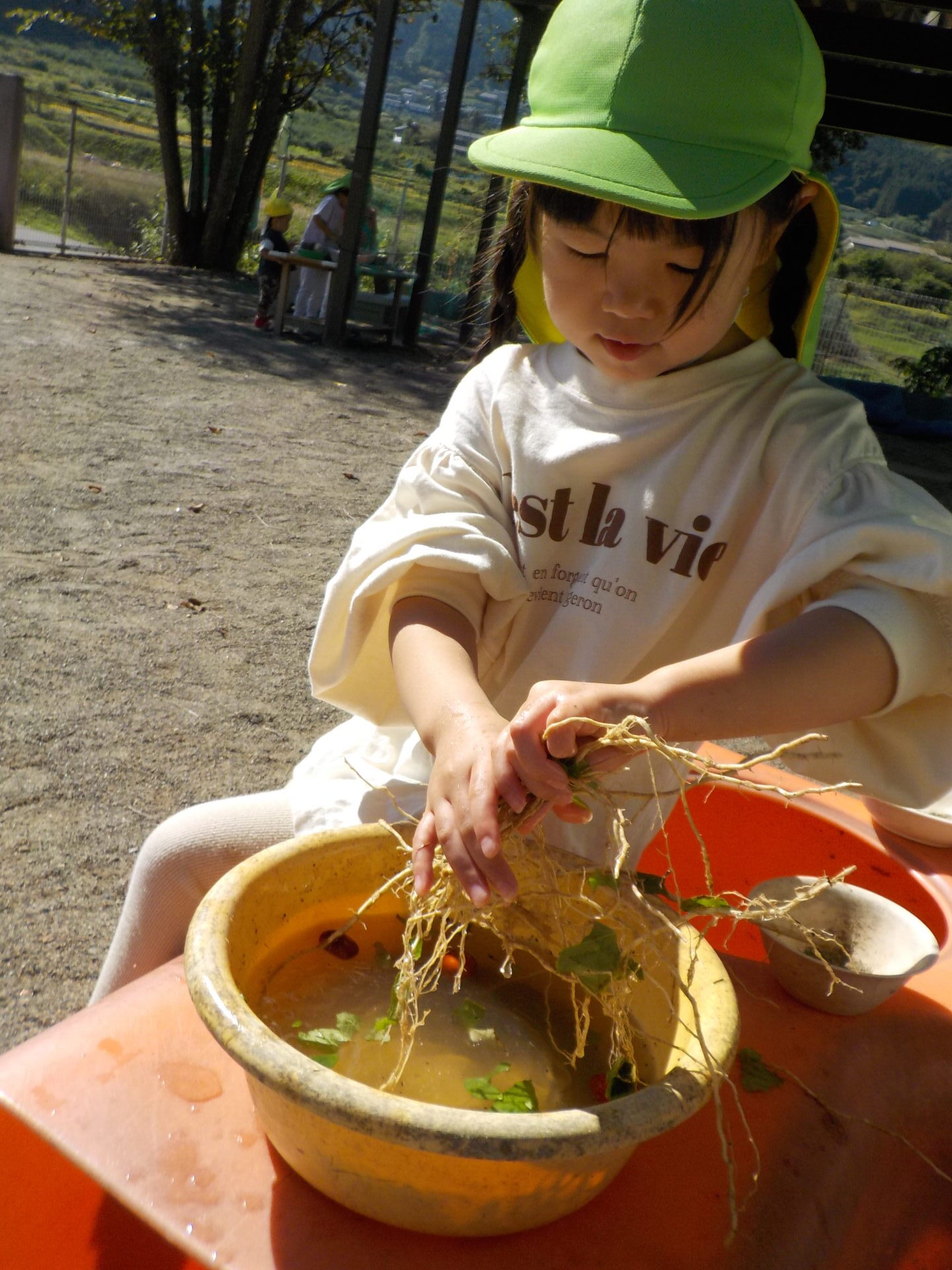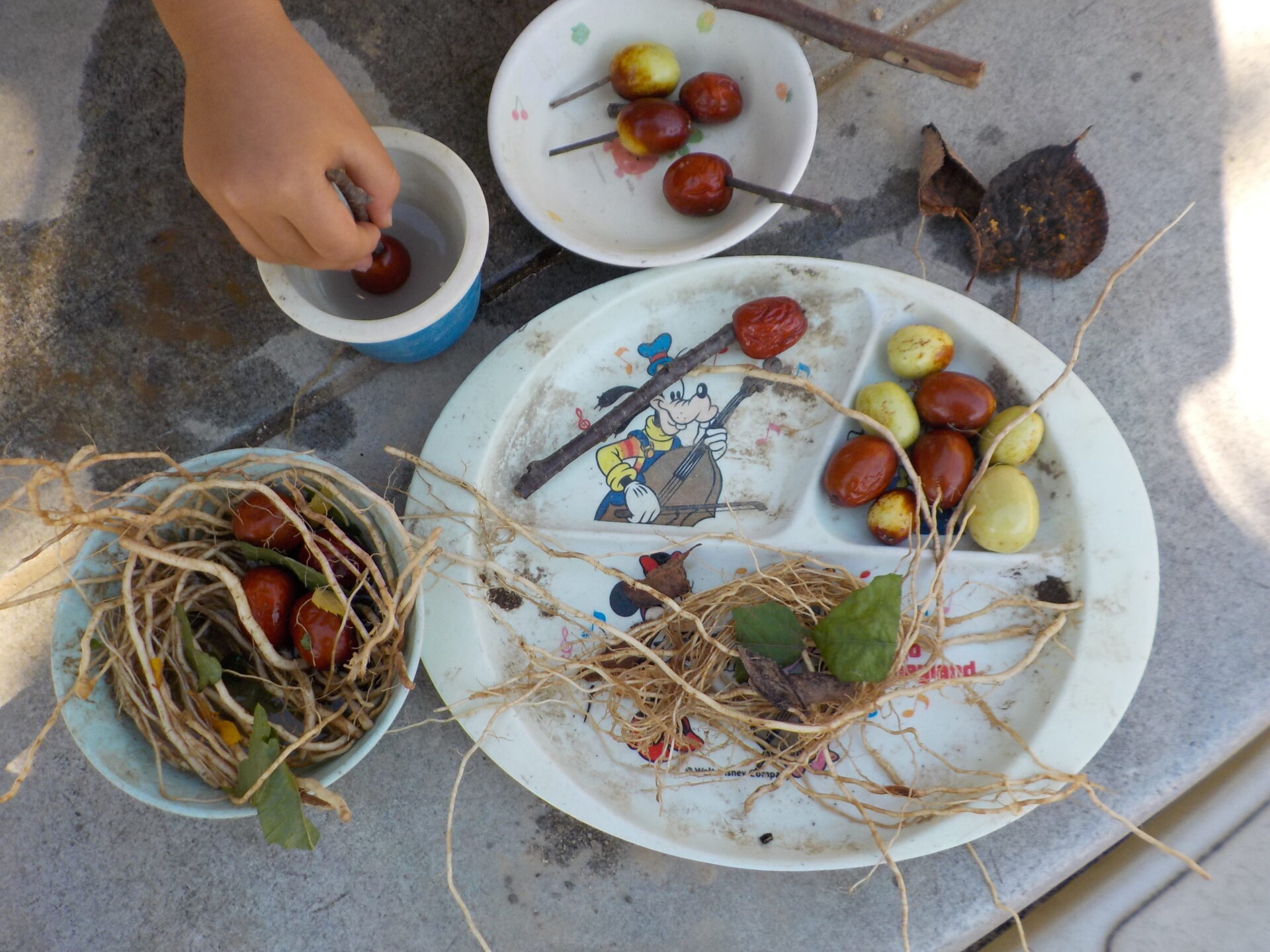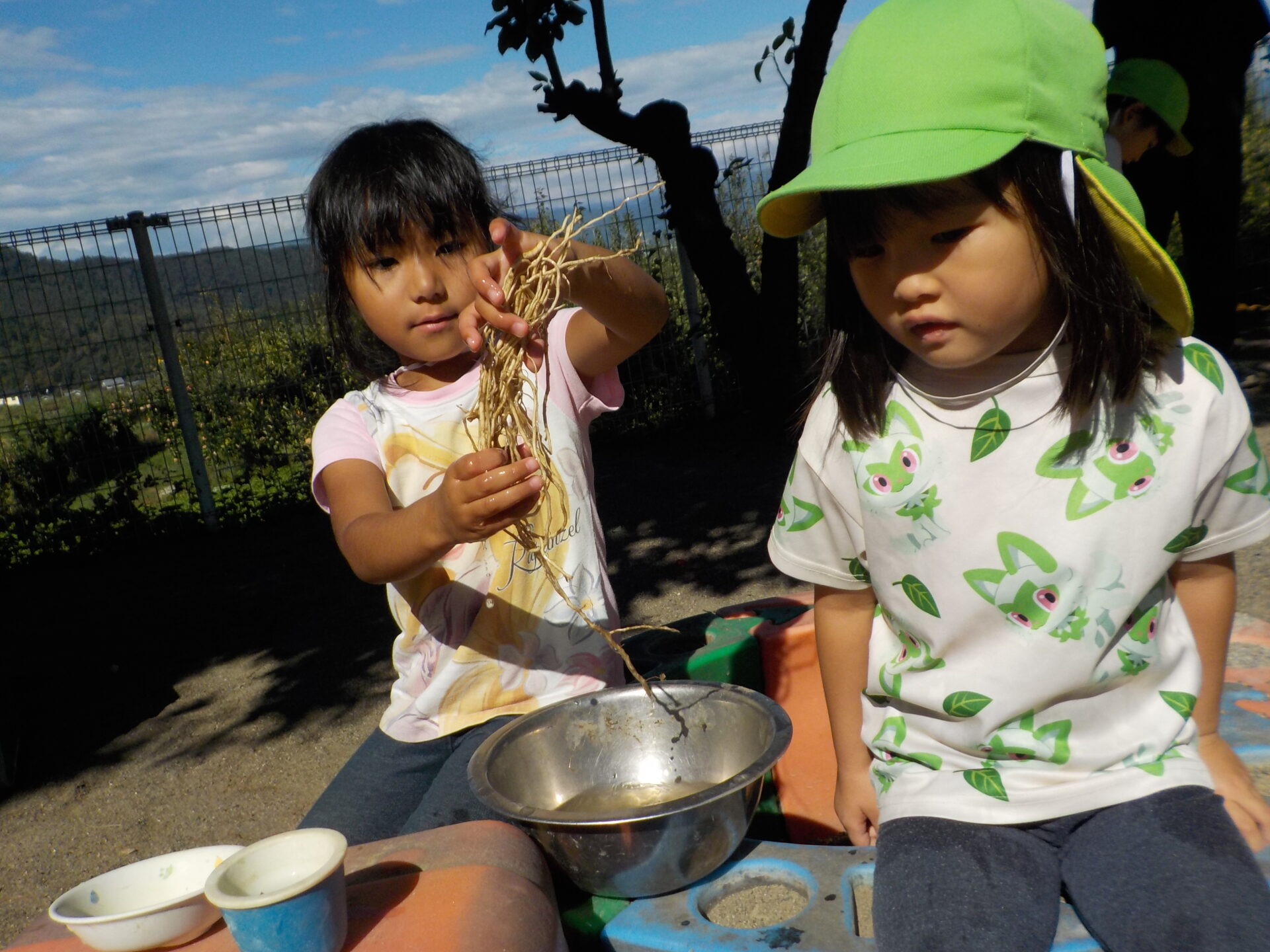 ・根っこを見た時の、「ラーメンみたい」という子ども達の発想に驚きました。その発想からままごと遊びが盛り上がり、次々に遊びが発展していきました。子ども達にとっては、見るもの全てが遊びに繋がるのだと改めて感じ、これからも自然を生かした保育をしていきたいと思いました。