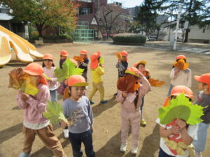 落ち葉を拾っていると「黄色の葉っぱと緑の葉っぱがあるね!」、「ハートに見える!」「(黄色の細長い葉っぱを見て)バナナみたい」と子どもたちなりに色々なものに見立てたり、大きさや色比べをしていました。