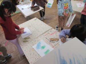 葉っぱの模様が浮かび上がってくると「見えてきた!」「きれいにできた!」と不思議そうに紙と葉っぱを見比べて楽しんでいました。