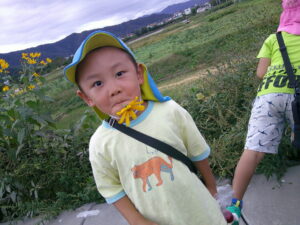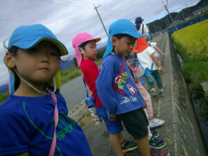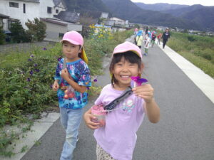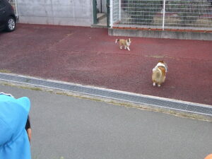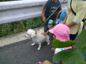 帰り道に土手方面へ歩いていくと、かわいいわんちゃんたちを見せてくれました!「かわいい!」とニコニコしながら手を振っていた子どもたちでした!