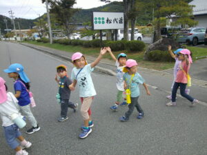 友達と手をつないで左右を見ながら横断して歩いて行きました!
