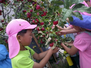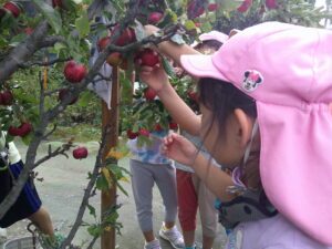 ひめりんごの採り方を教えていただきました!「ひねりながら採るんだよ!」試行錯誤をしながら一生懸命に採ろうとする子どももいました。