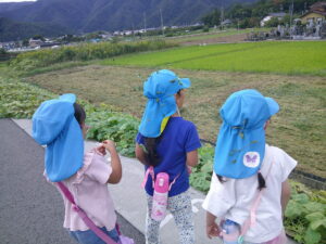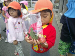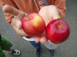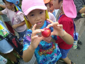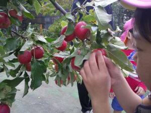 ・出発前に、「ひめりんごはどんな大きさなのかな?」と尋ね、ひめりんごに対する興味を持っていました。実際に見たり触って収穫させていただいて、ひめりんごの大きさを興味津々で確かめていました。匂いを嗅いだり、触ったり見たりする中で、五感を使いながら楽しんでいた姿がありました。
