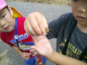 捕まえたかまきりを見せあいっこして楽しんでいました!