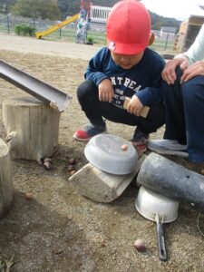 どんぐりや秋の木の実は、転がす遊び、ままごと、宝物などいろいろな物に変身して遊びを楽しませてくれています。この時期にしかできない遊びを庭で思い切り楽しんでいきたいと思います。