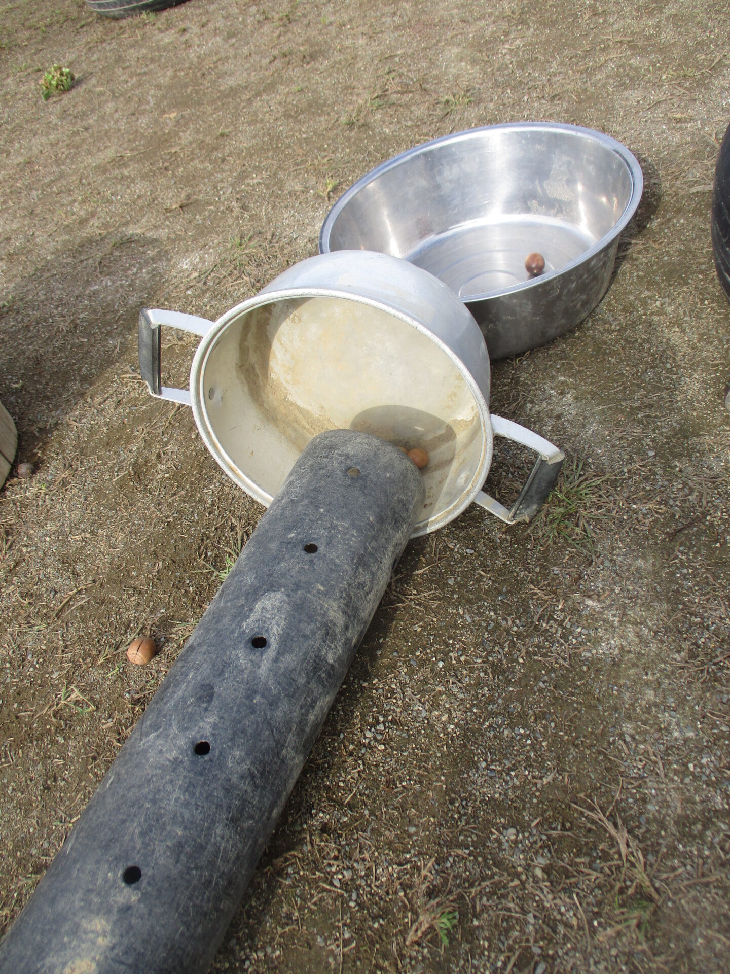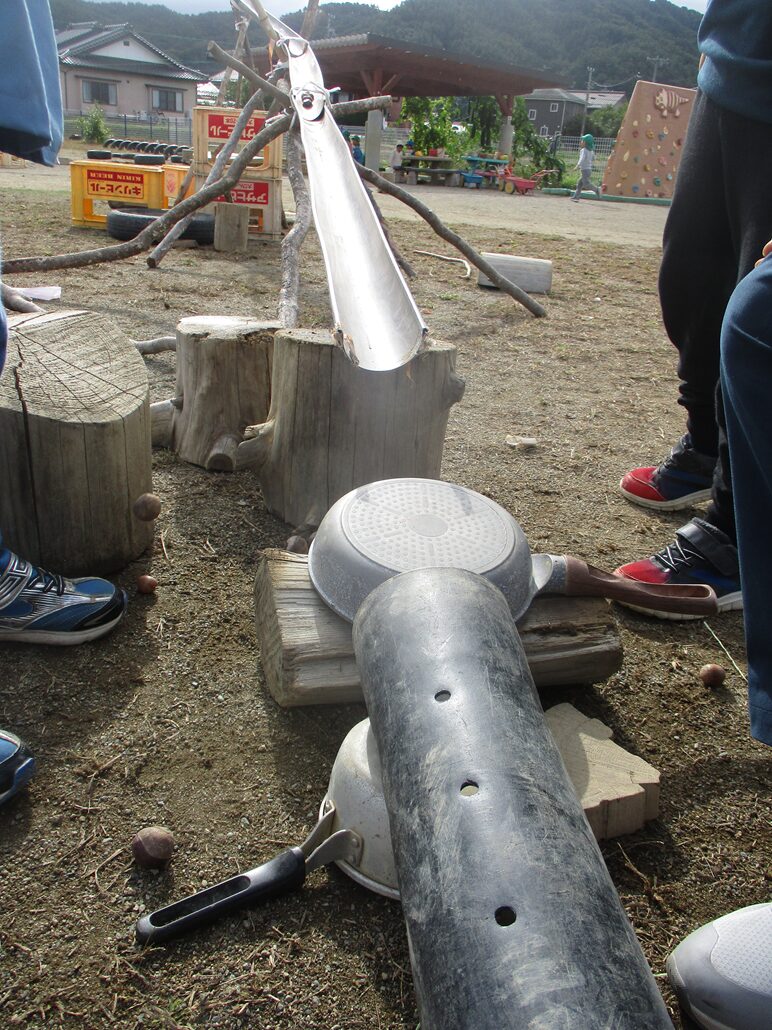 この日は年長さんが転がすだけではなく、途中でどんぐりを飛ばして「かん♫」という音を鳴らしてみたい!という思いから塩ビ管の途中にフライパンを設置していました。