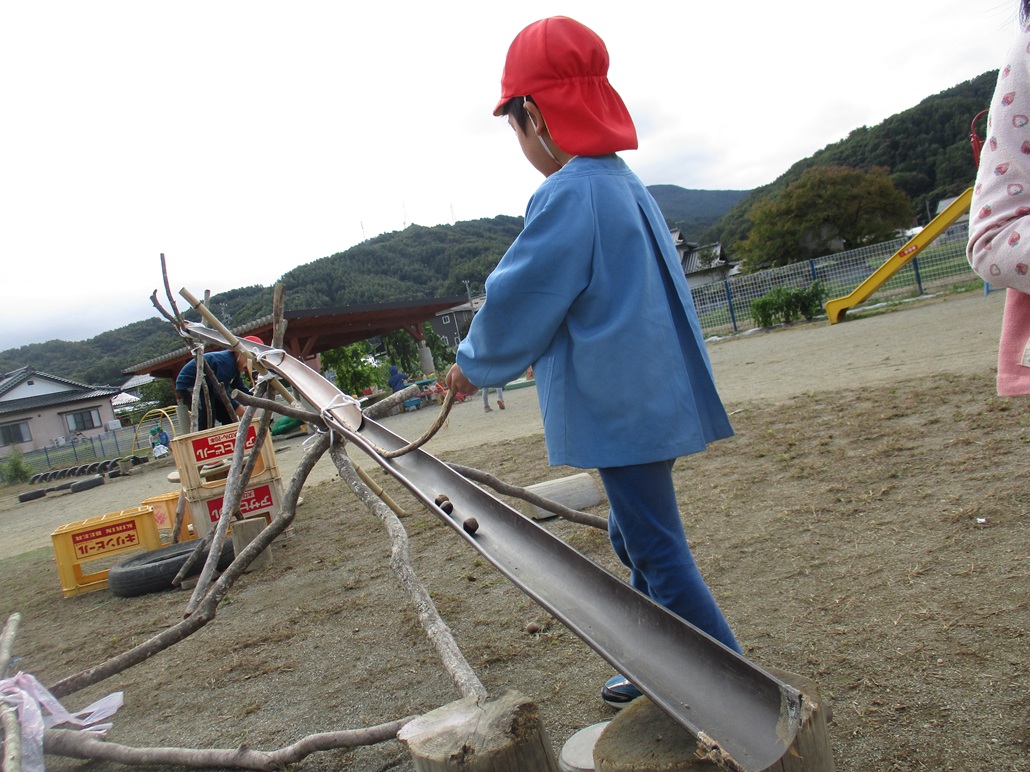 どんぐりの大きさや形にも気付き、うまく転がるには…を考えながら遊びを進める姿はさすが年長さん。