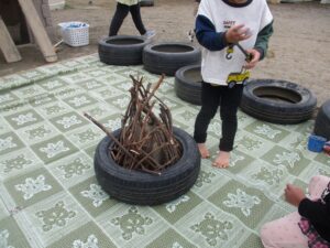 散歩で見つけてきた木の実や、お家から持ってきてくれたとちの実を使った遊びが盛り上がっています。