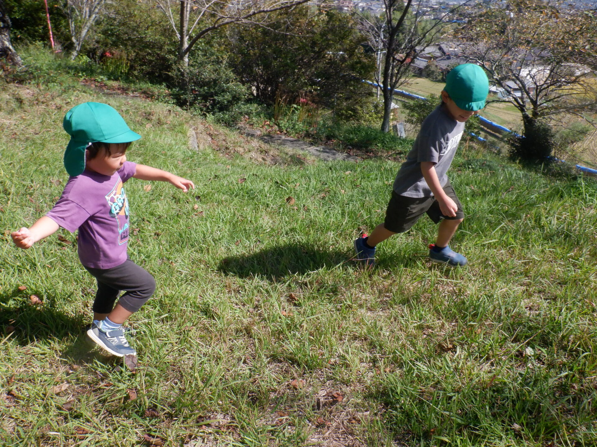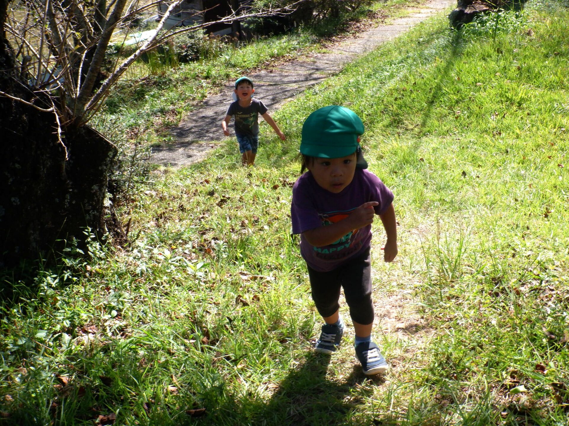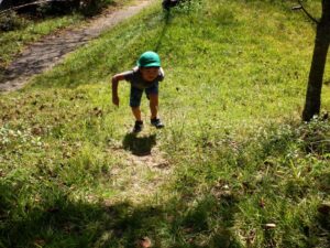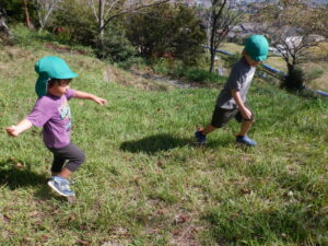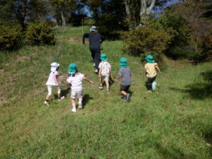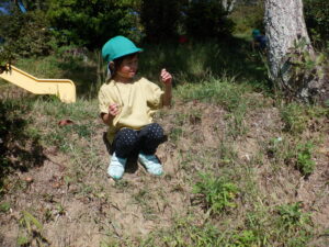 ・今までも万寿山への散歩に出かけ、ぱんだ探検を楽しんできた子どもたちだった。経験を重ねてきたことで、どんどん自分たちから土手を登ったり下りたり、あっちもいきたいと探検しようとしたりやってみようとしたりする姿が増えてきている。気持ちや体の成長につながっていることを感じるので、引き続き同じ場所での散歩も楽しみたい。