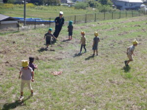 子どもたちの大好きなのらねこぐんだんになって、保育園でも遊んでいるしっぽとりをしました。のらねこたち対マーミーちゃん!元気に走り回る子どもたちでした!